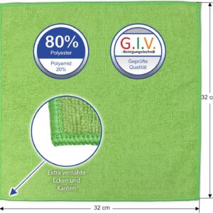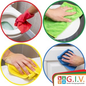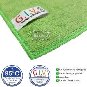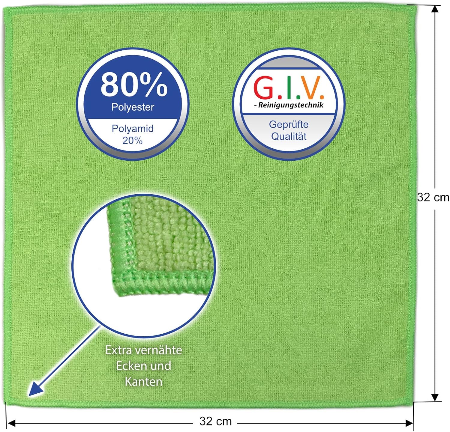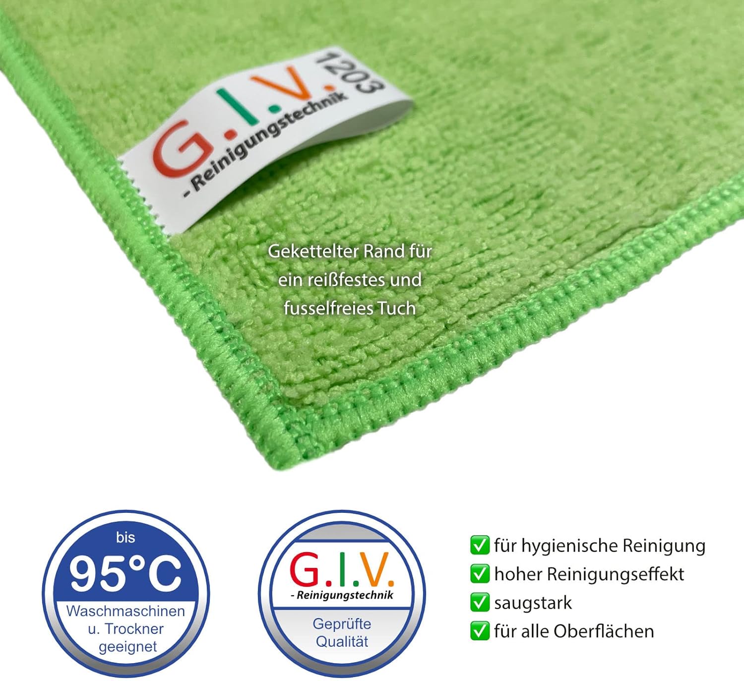 Die G.I.V. Mikrofasertücher überzeugen durch ihre Langlebigkeit und robuste Verarbeitung mit verstärkten Ecken und Kanten. Sie sind für eine häufige Wiederverwendung ausgelegt und können bei bis zu 95°C in der Maschine gewaschen werden, was sie besonders hygienisch macht.