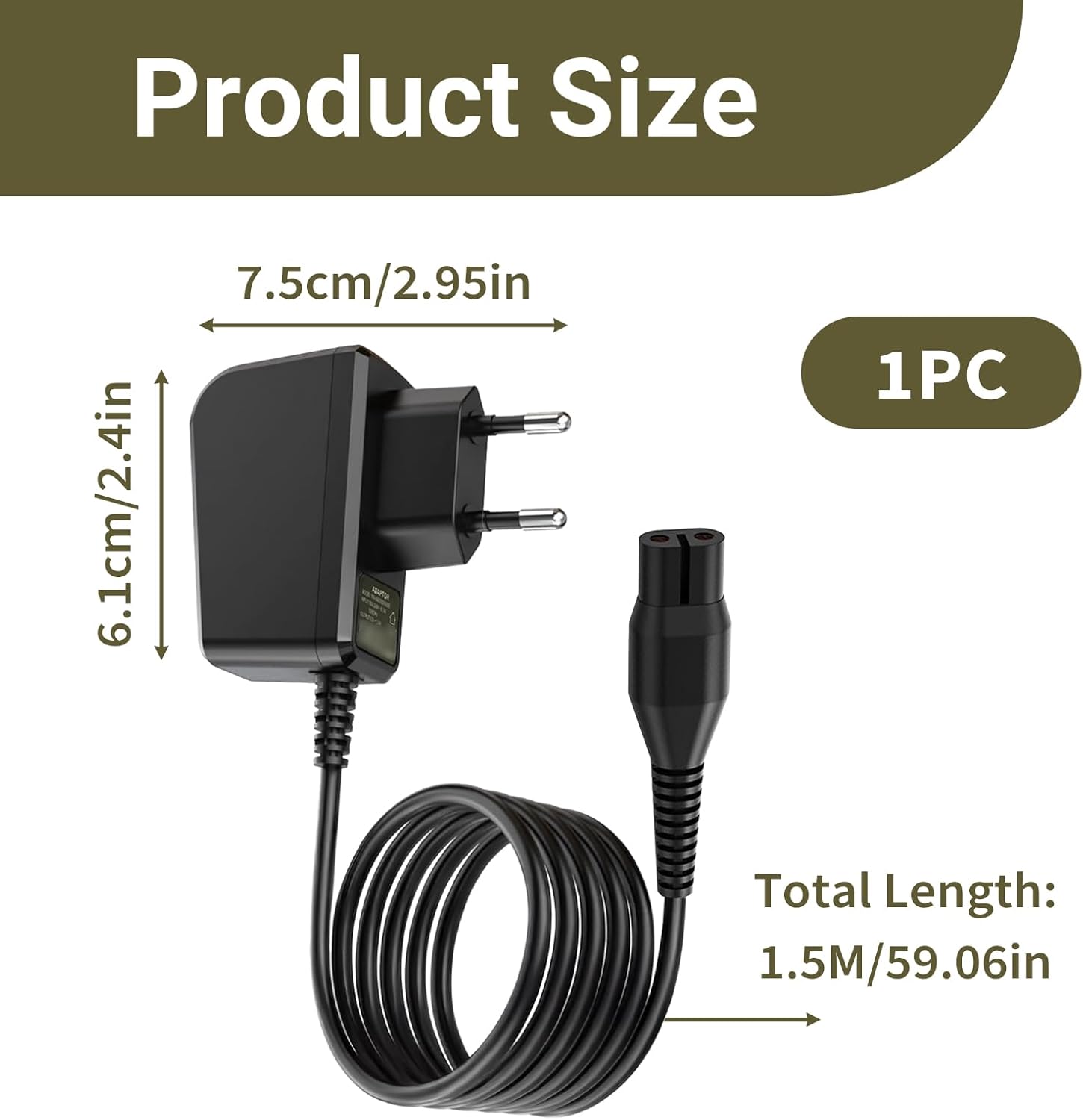 Das Netzkabel verfügt über eine Länge von ca. 1,5 Metern (5 Fuß). Diese großzügige Kabellänge bietet Ihnen mehr Flexibilität beim Aufladen, insbesondere wenn die nächste Steckdose etwas weiter vom Einsatzort entfernt ist.