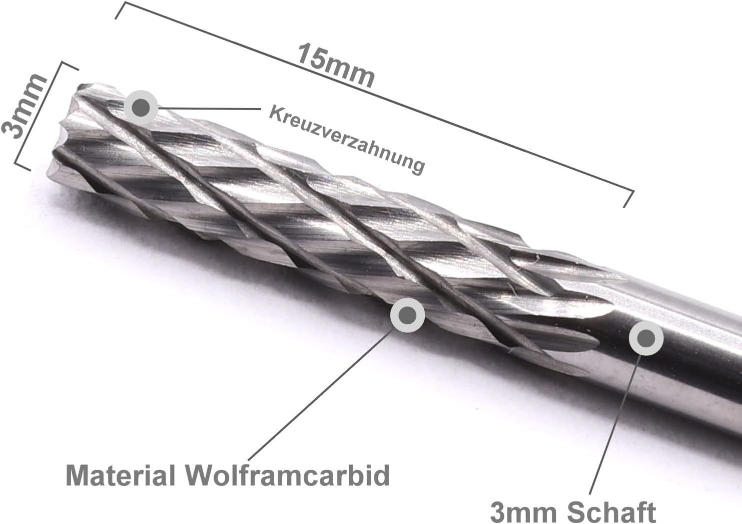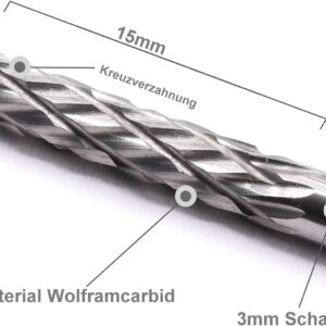 Die in diesem Set enthaltenen 5 Zylinderfräsen verfügen über einen Werkzeugdurchmesser von 3 mm. Zudem ist der Dorndurchmesser (Schaft) ebenfalls auf 3,0 mm ausgelegt, was eine einfache Kompatibilität mit gängigen Spannzangen ermöglicht.