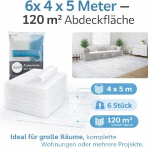 Die benötigte Größe hängt von der abzudeckenden Fläche ab. Eine 4×5 Meter Plane bietet mit 20 m² ausreichend Abdeckung für größere Möbelstücke oder mittlere Bodenflächen. Im 6er-Set erhält man insgesamt 120 m² Abdeckfläche, ideal für umfangreiche Renovierungsprojekte oder mehrere Räume.