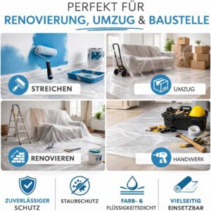 Renovierungen und Sanierungen: Schütze Möbel, Küchen und Einrichtung vor Staub, Schmutz und Bauschutt bei Durchbrüchen, Verputzarbeiten oder Bohrarbeiten. Die Plane eignet sich besonders für Räume, die weiter genutzt werden, während nebenan renoviert wird.