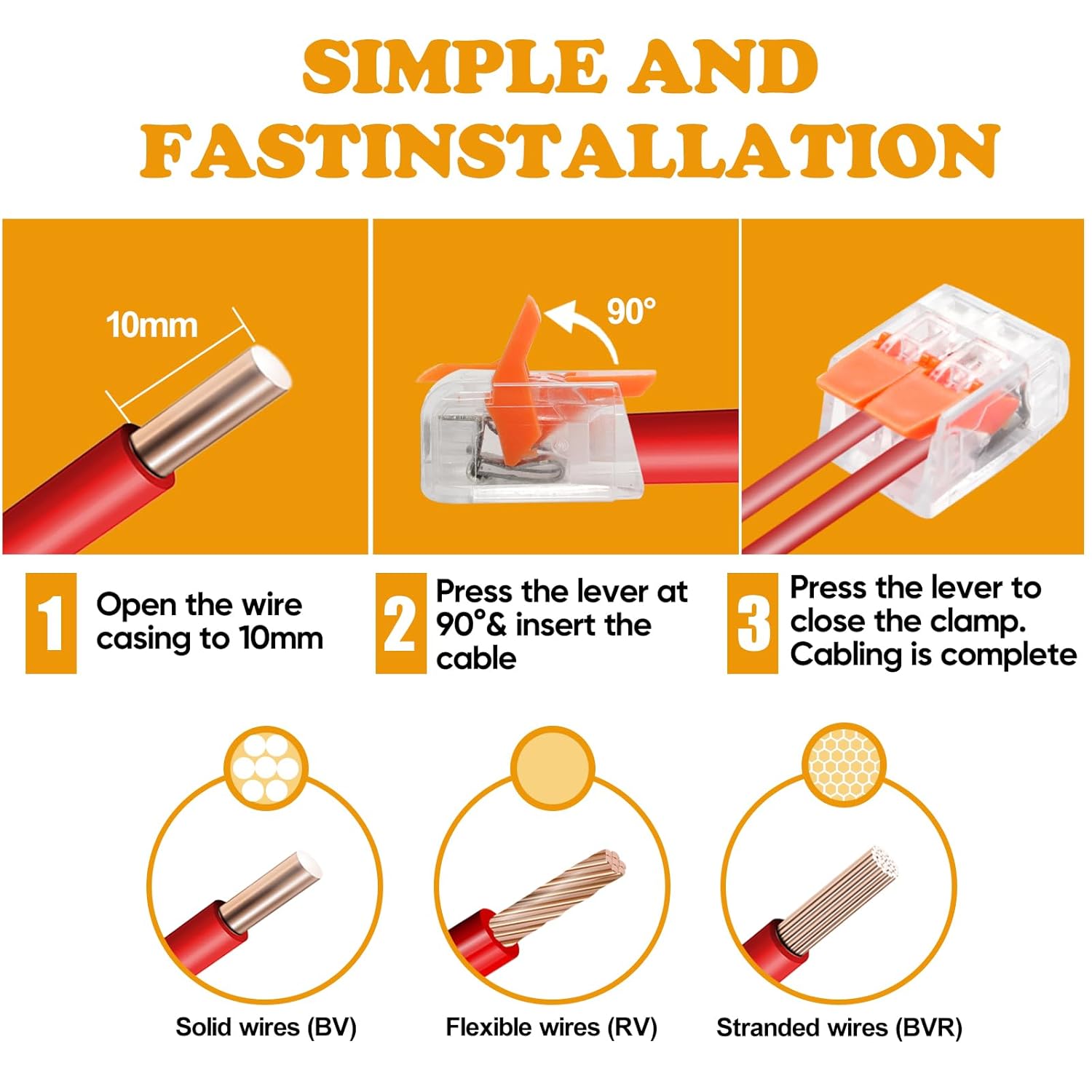 Das Design der Klemmen ermöglicht einen manuellen Anschluss ohne Werkzeug. Entfernen Sie zunächst etwa 9-10 mm des Drahtmantels, klappen Sie den orangefarbenen Hebel um 90° nach oben, führen Sie das Kabel ein und schließen Sie den Hebel wieder.