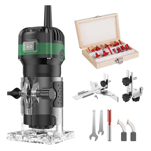 800W Oberfräse Holz Elektro Kantenfräse, 6-Gang Variable Geschwindigkeit 33000U/min Einhandfräse, 6,35mm Spannzange Holzfräse 15-teiligem Fräser-Set in Holzbox, Präzisions-Trimmer für Holzbearbeitung