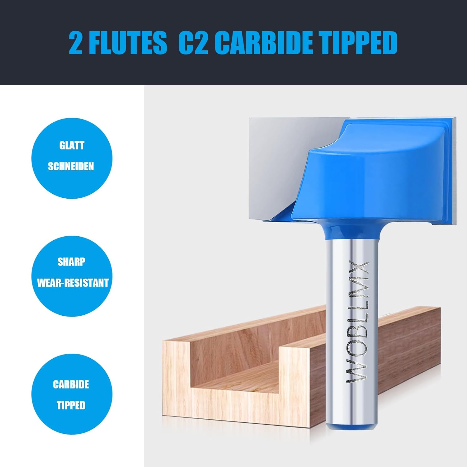 - Hartmetall-Bestückung: Die C2-Carbide-Schneiden bleiben deutlich länger scharf als herkömmlicher Werkzeugstahl, was besonders bei abrasivem Plattenmaterial den Unterschied macht.