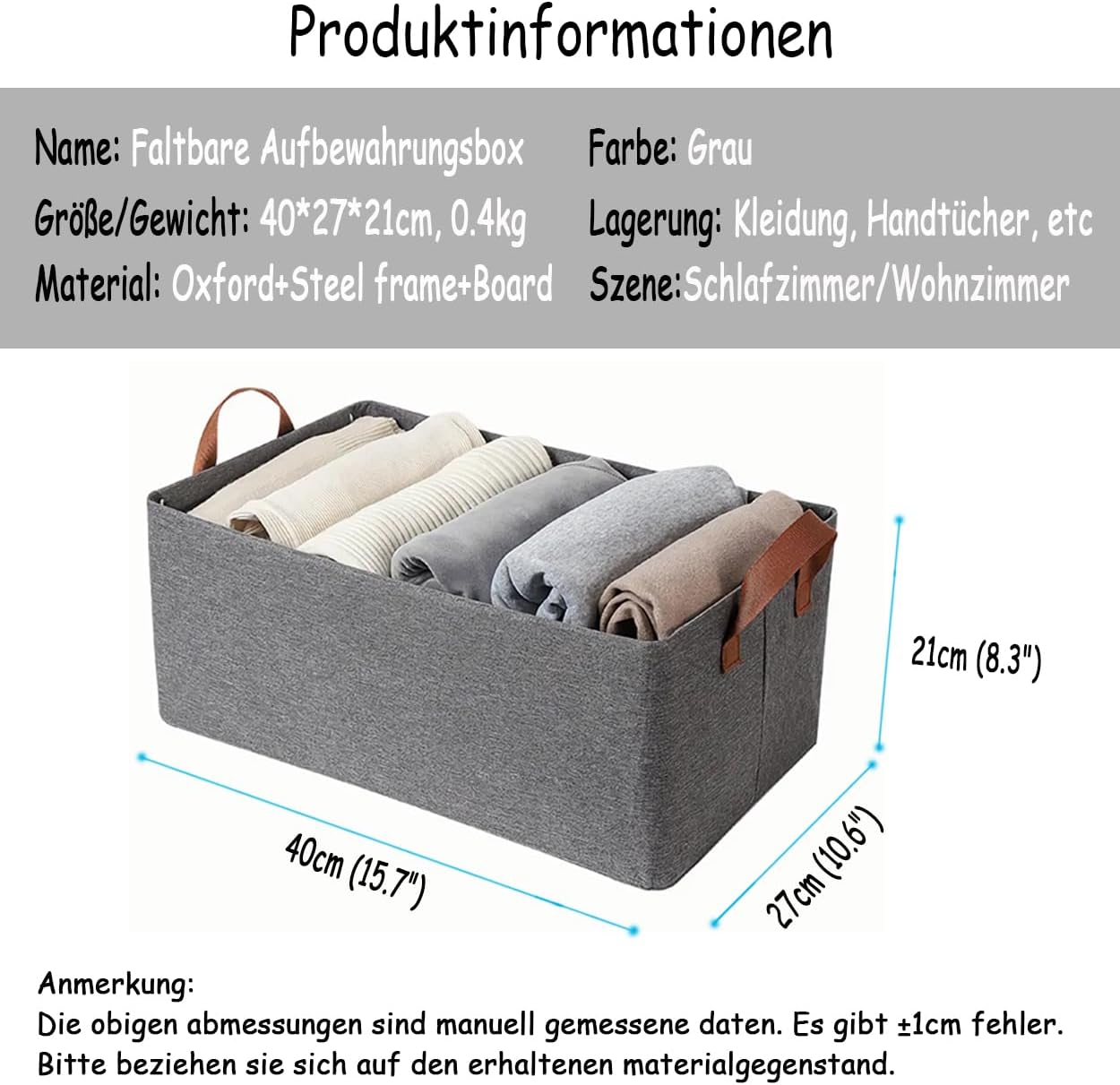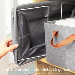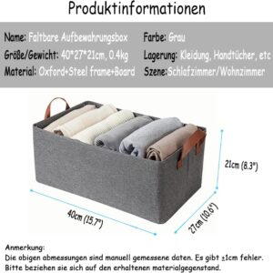 Die grauen Aufbewahrungskörbe aus Stoff verfügen über eine große Kapazität und messen jeweils 40 x 27 x 21 cm. Diese Abmessungen bieten ausreichend Platz, um Ihre täglichen Ordnungsprobleme effizient zu lösen.