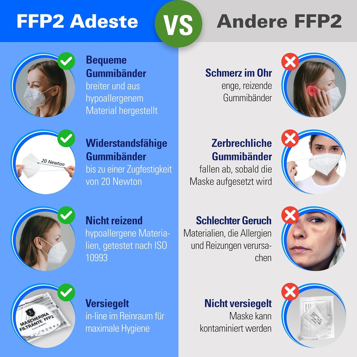 Achte beim Kauf unbedingt auf das CE-Zeichen gefolgt von einer vierstelligen Nummer auf der Maske, da nur diese Produkte den europäischen Sicherheitsstandards entsprechen. Was viele unterschätzen: Viele Billigimporte sehen auf den ersten Blick gleich aus, halten aber im Dauereinsatz nicht dicht. Die ADESTE-Masken haben bei den Anwendertests bisher überzeugt und halten das, was man von einer FFP2-Maske dieser Klasse erwartet.