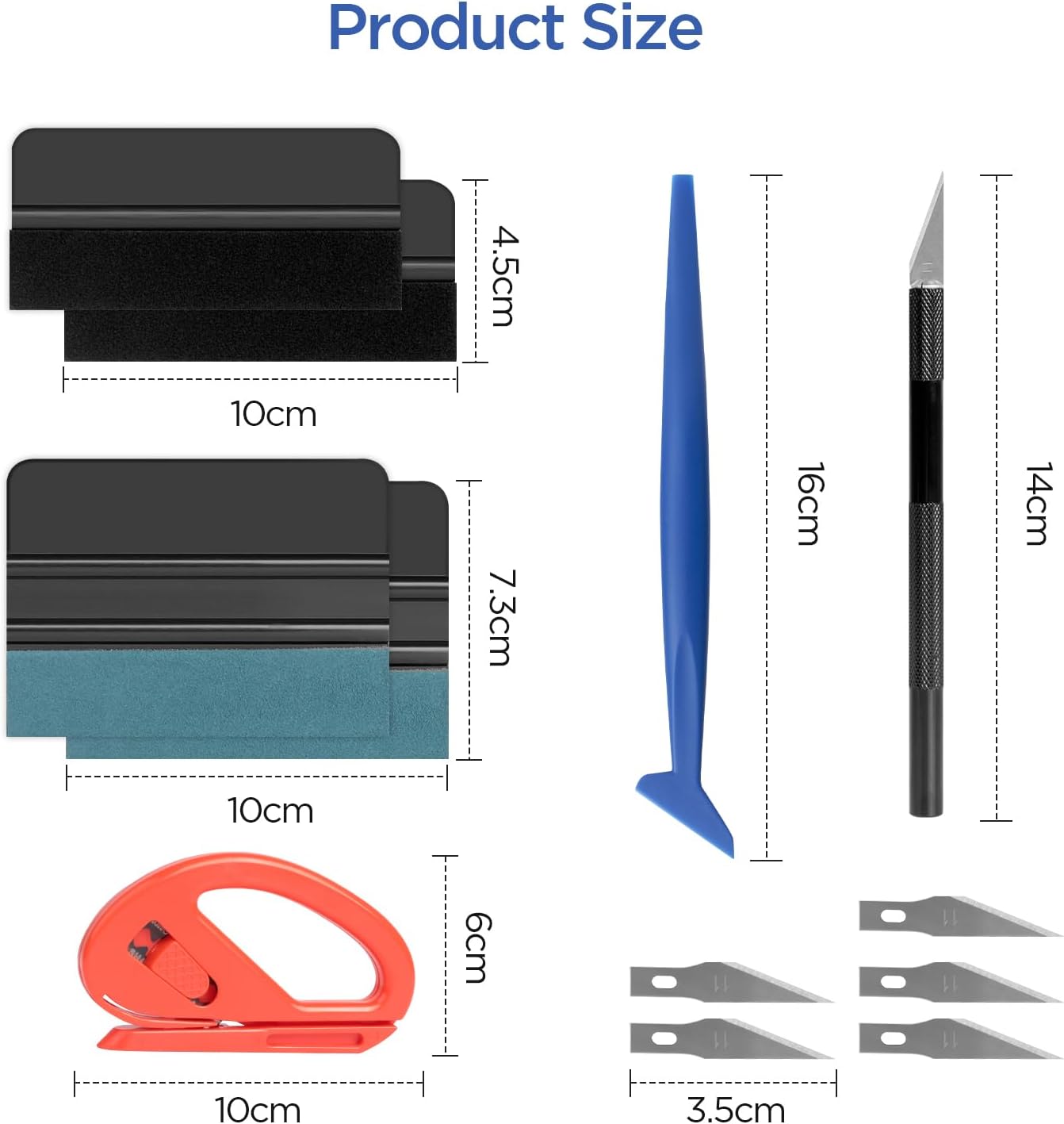 Das AiQInu Film Squeezer Set besteht aus insgesamt 7 Teilen für unterschiedliche Aufgaben bei der Folierung. Es enthält zwei große Rakel für trockene Folien und große Flächen, zwei kleine Rakel für nasse Folierungen sowie einen Präzisionsschneider inklusive 5 Ersatzklingen. Zusätzlich sind ein Folienschneider und ein blauer Mikro-Rakel für Detailarbeiten enthalten.