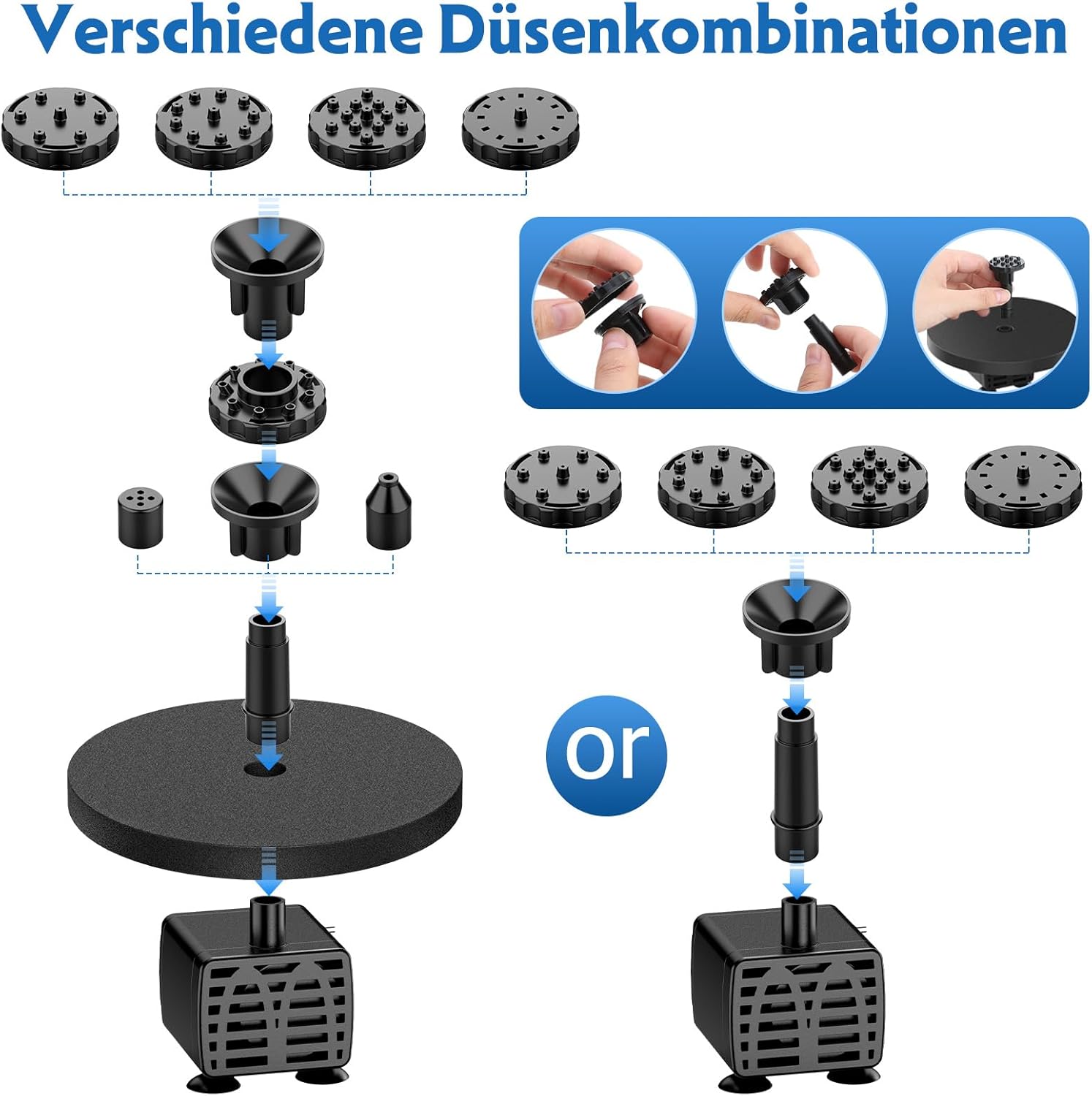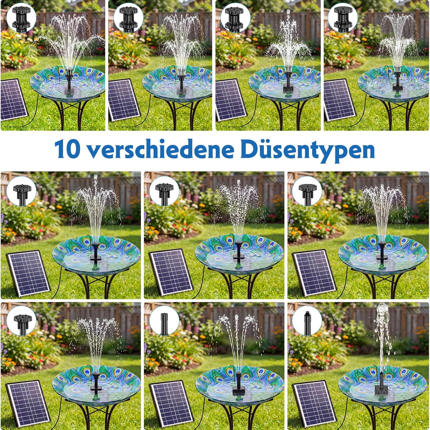 - 10 Fontänen-Aufsätze: Bietet maximale Flexibilität bei der Optik, vom feinen Sprühnebel bis zum kräftigeren Strahl.