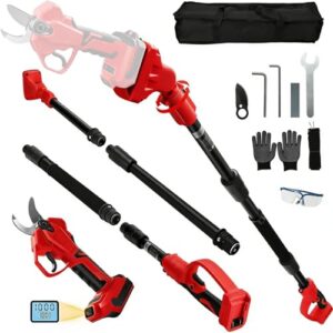 • Leistungsstarke elektro baumschere & LCD Display – Diese set elektrischer professioneller Gartenscheren wird mit Bürstenloser Motor, Der Kraftvoll, Leistungsstark Und Schnell Schneidet, Mit dieser Schere ist das Schneiden von Ästen so einfach wie Butter, mit einem LCD-Display ausgestattet, Diese hohe Ast schere ist mit einer abnehmbaren Verlängerungsstange ausgestattet, die in vier Abschnitte zerlegt werden kann und in drei verschiedenen Längen installiert werden kann: 4.7ft/6.5ft/8.5ft