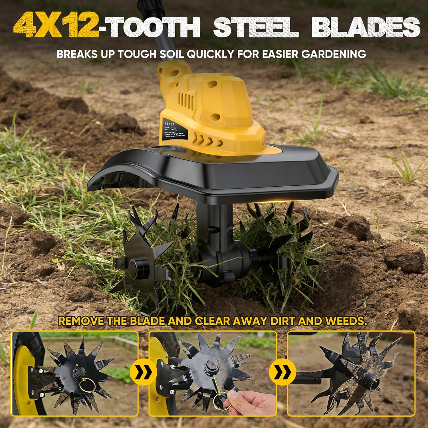 • HOCHWERTIGE MESSER & OPTIMALE ARBEITSABMESSUNGEN 4 × 12 Zoll Manganstahlmesser sorgen für Langlebigkeit und Stabilität bei dieser Bodenhacke. Arbeitsbreite 9 Zoll, Arbeitstiefe 8,3 Zoll – perfekt zum Zerkleinern von hartem Boden, Mischen von Kompost, Lockern von Lehmboden und Entfernen von Unkraut mit Wurzeln für gesundes Pflanzenwachstum.