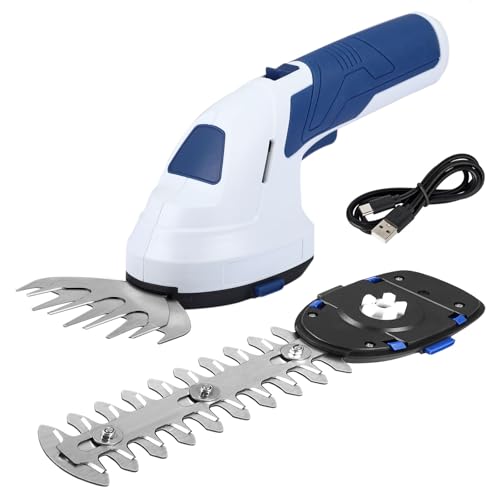 Akku Gras- und Strauchschere, 2-in-1 Gartenschere 7.4V, 2000mAh Akkus, Messerlänge: 17,5 cm (Strauch) / 10,5 cm (Gras), Kabelloser Elektrischer Heckenschere für Garten und Rasen