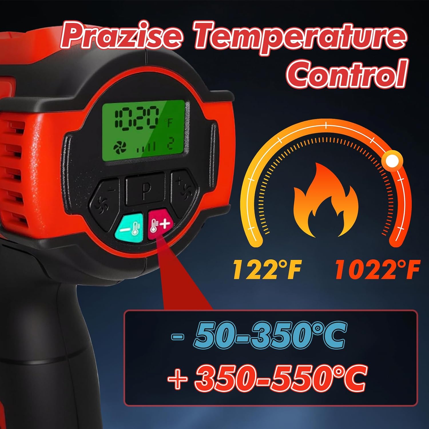 - Präzise Temperatursteuerung: Das digitale LCD-Display ermöglicht eine stufenlose Einstellung von 50 °C bis 550 °C, perfekt für materialgerechtes Arbeiten.