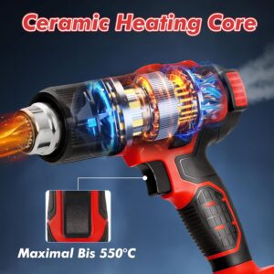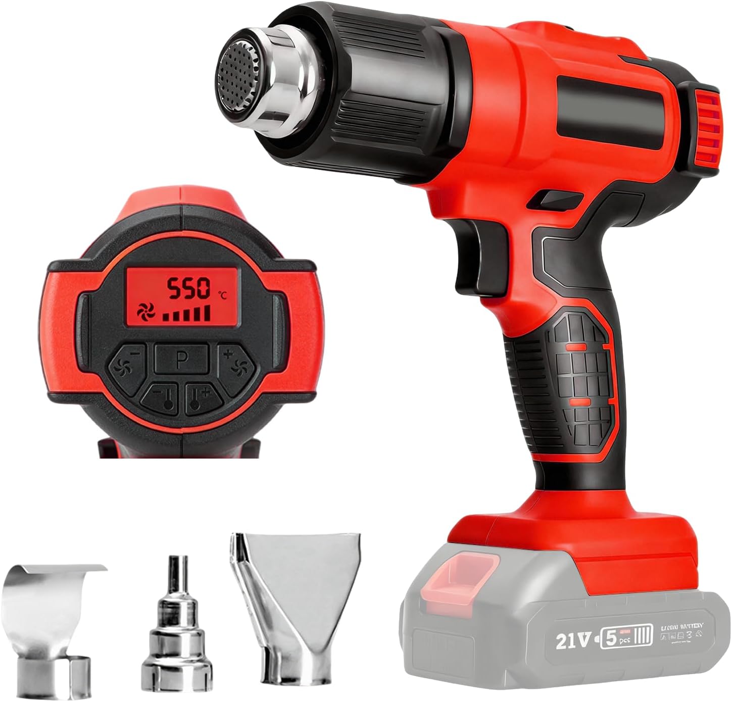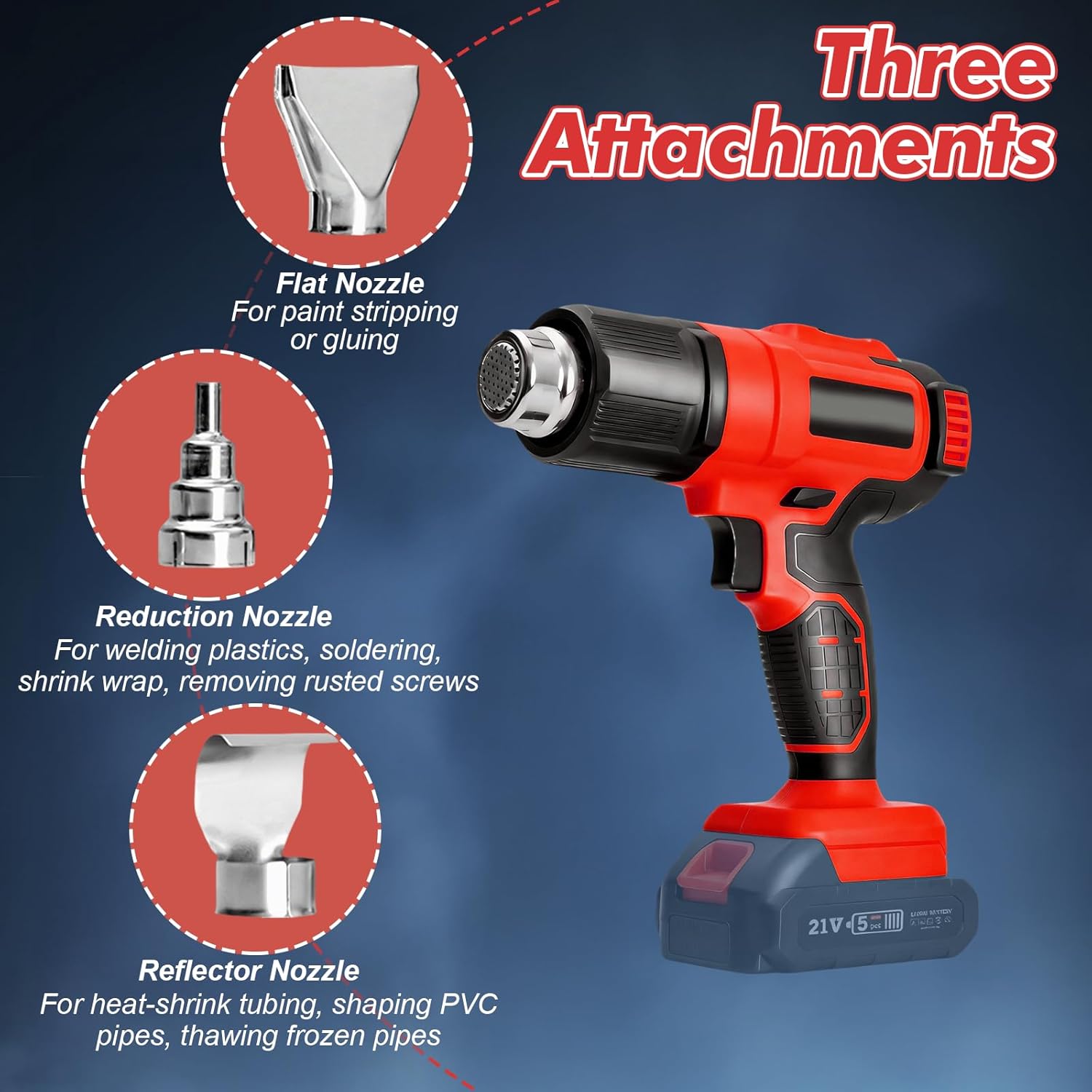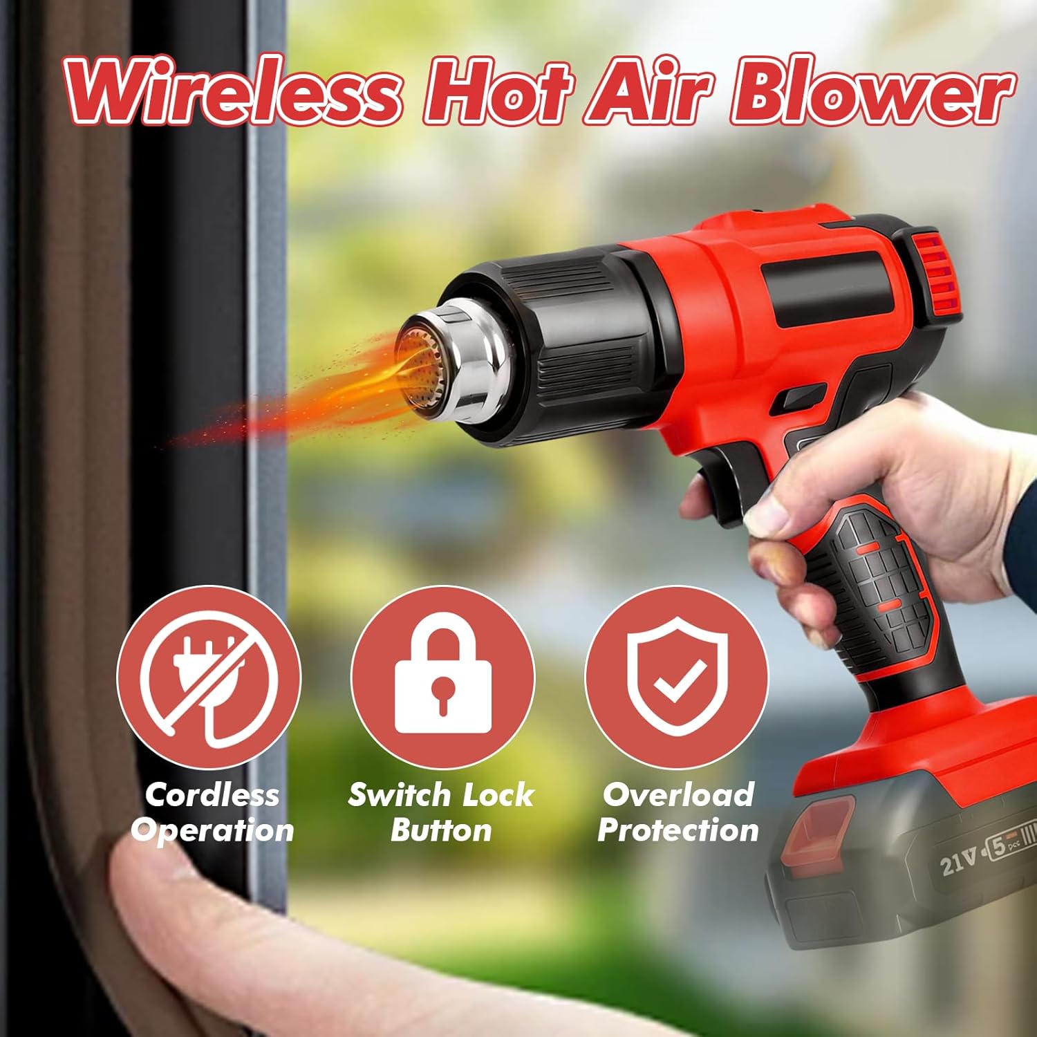 Das kabellose und tragbare Design ermöglicht einen flexiblen Einsatz des Heißluftföns in unterschiedlichsten Umgebungen, ohne dass eine externe Stromquelle oder eine Steckdose in der Nähe sein muss. Dank der kompakten Größe lässt sich das Gerät zudem problemlos in einem Werkzeugkasten oder Rucksack transportieren und ist schnell einsatzbereit.