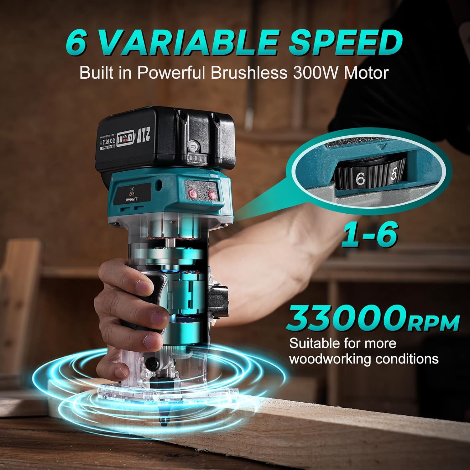 - 6-stufige Drehzahlregelung (10.000-33.000 U/min): Passe die Geschwindigkeit präzise an Hartholz, Weichholz oder Kunststoff an – für saubere Kanten ohne Ausfransungen