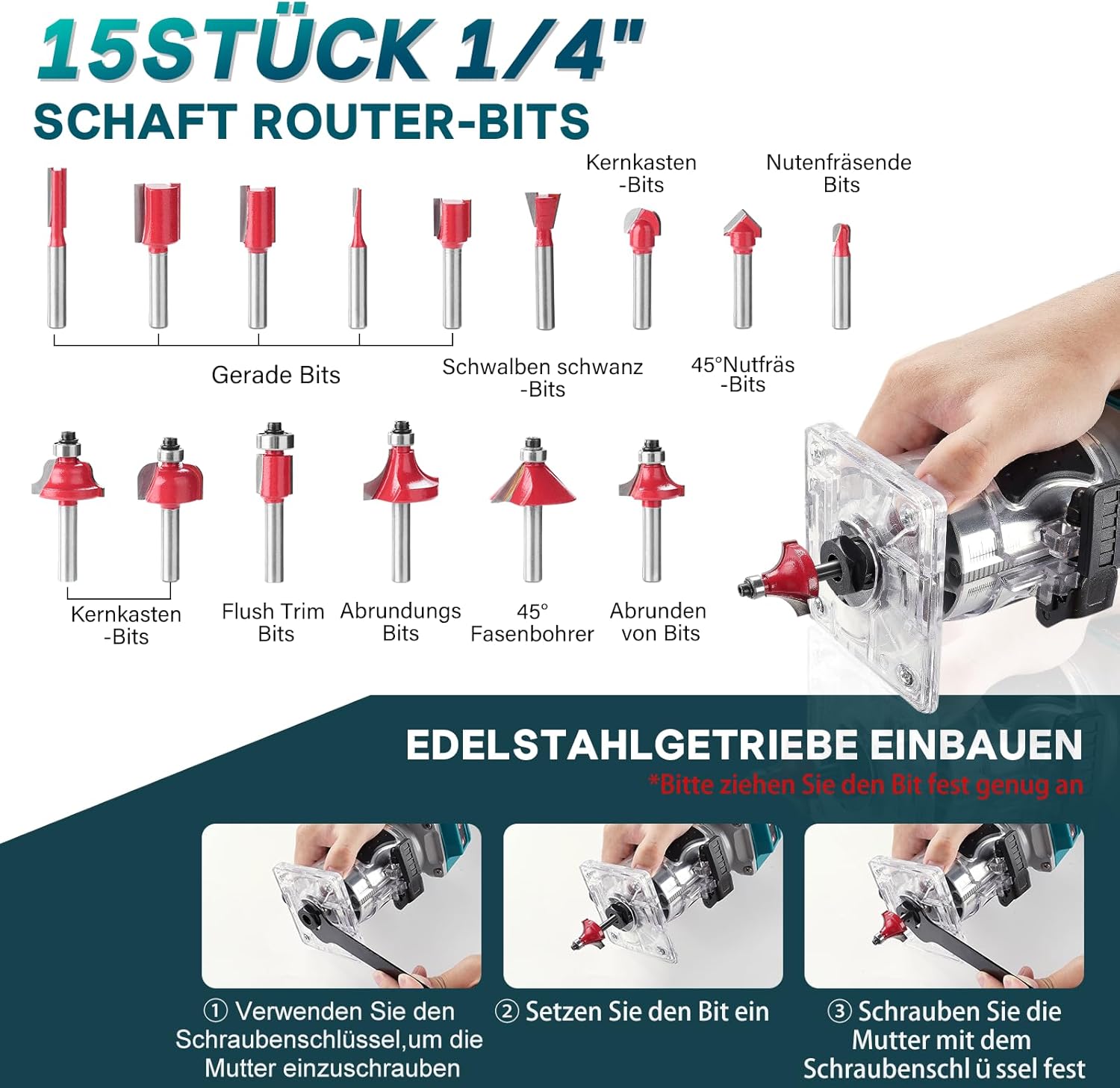 | Lieferumfang Fräser | 15 Stück (1/4″ Schaft) |