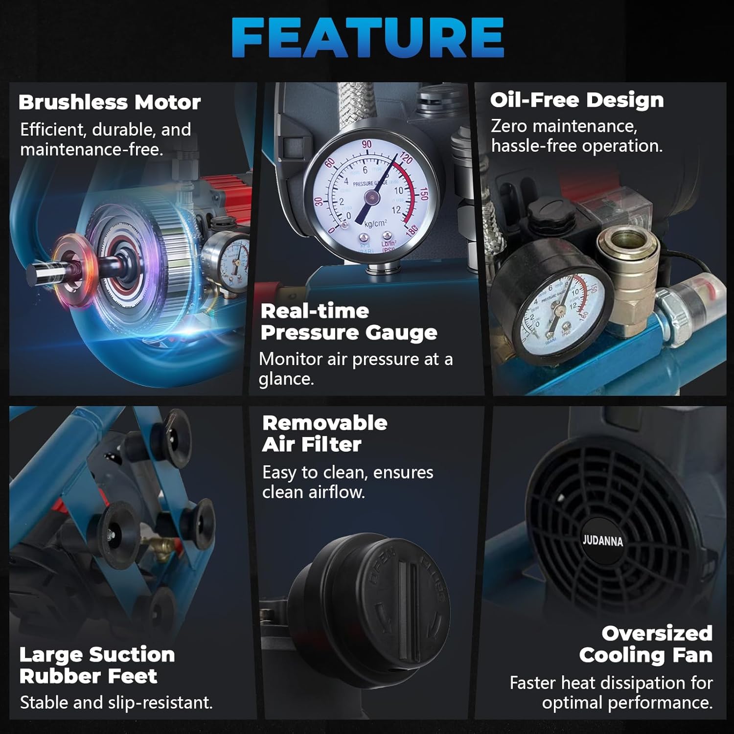 • 【Ölfreier Druckluftkompressor】Der Kompressor ist vollständig ölfrei, liefert gereinigte Luft und für den täglichen Gebrauch ist fast keine Wartung erforderlich.