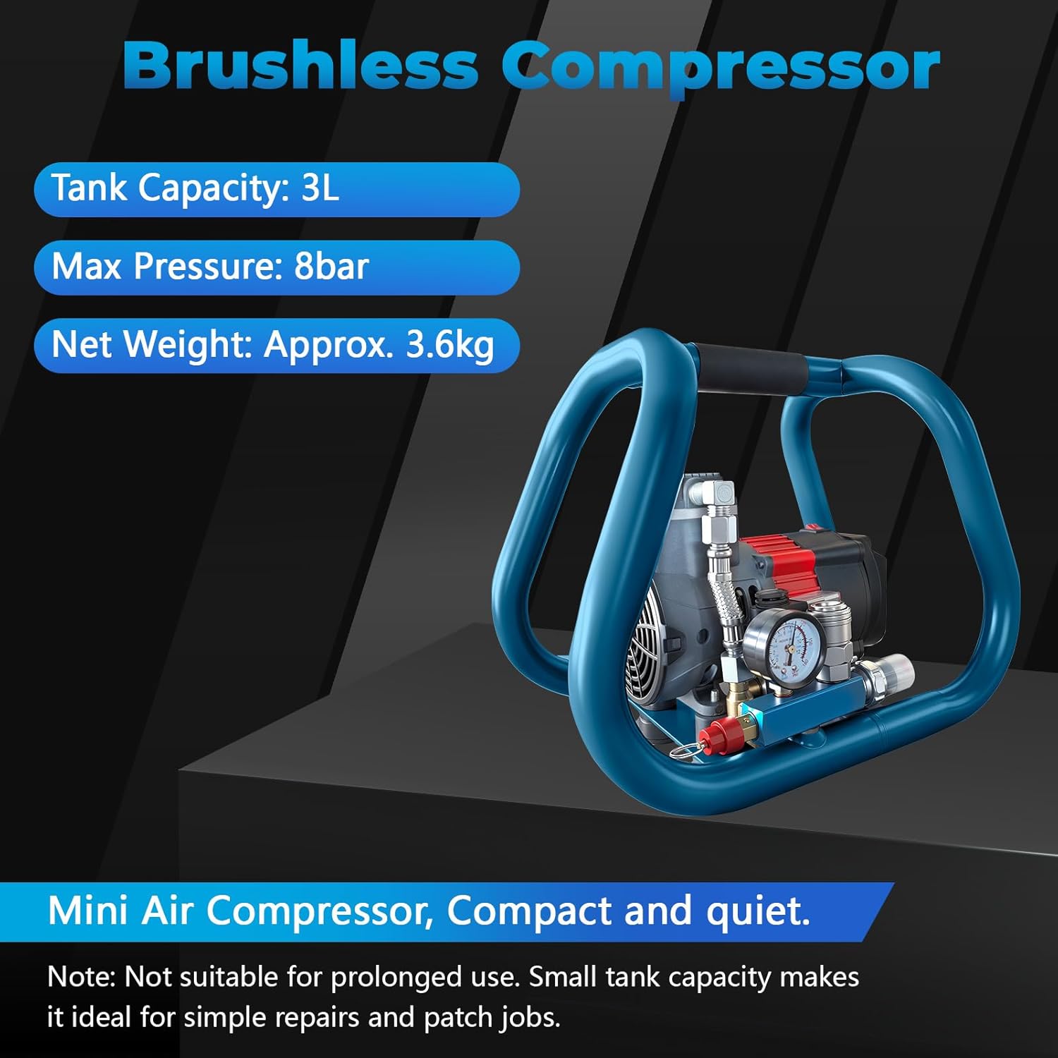 • 【Luftkompressor 8bar】Der reine Kupfer-Bürstloser Motor erreicht eine Drehzahl von 2800 U/min, mit einem Maximaldruck von 8 bar und mit einer Gasflaschenkapazität von 3 Litern. Bei Verwendung eines 4A-Akku beträgt die Verdichtungszeit nur 15 Sekunden, und die kontinuierliche Luftzufuhr dauert 45 Minuten. Die Anzahl der Vollladungen des 4A-Single-Akkus hat 150-mal erreicht.