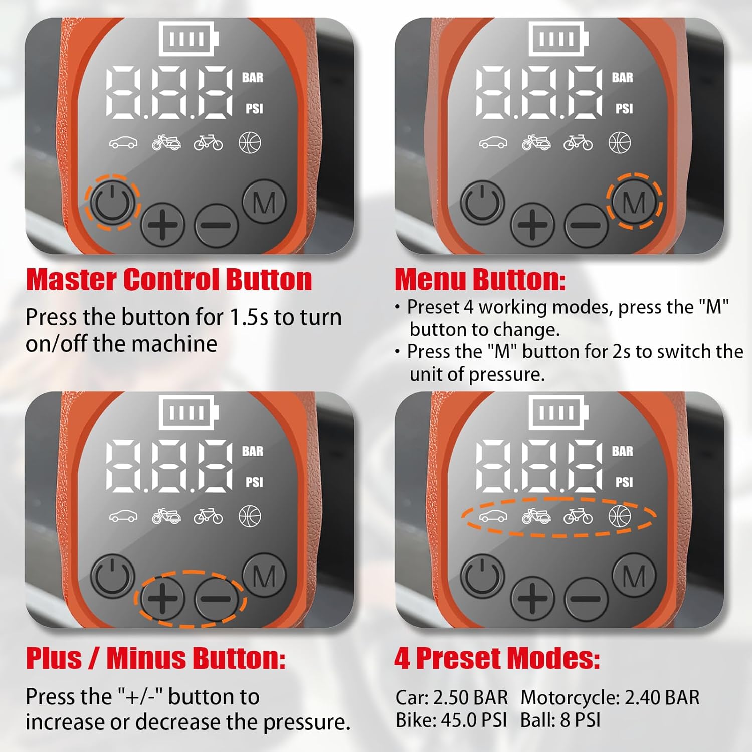 Dieser Akku Kompressor Inflator ist primär für die Druckkontrolle und Befüllung von Luftreifen und Freizeit-Equipment konzipiert. Er richtet sich an KFZ-Begeisterte, Radsportler und Camping-Fans. Die Anwendung erfolgt vorwiegend im Außenbereich, in der heimischen Werkstatt oder direkt am Fahrzeug.