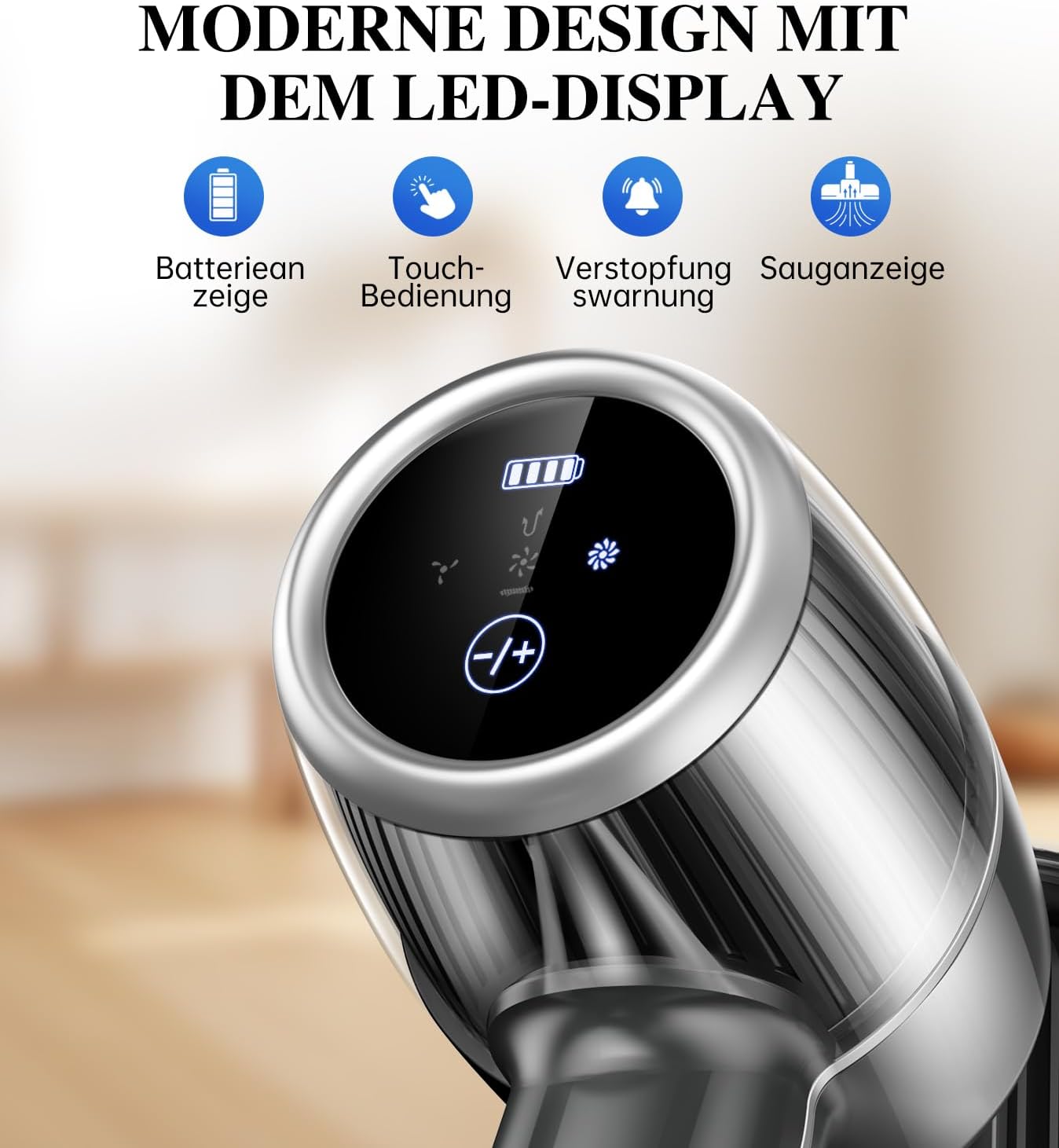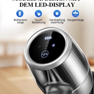 - Touchdisplay mit Batterieanzeige: Du siehst auf einen Blick, wie viel Reinigungszeit noch verfügbar ist und wechselst zwischen 3 Leistungsstufen ohne Knöpfe drücken zu müssen