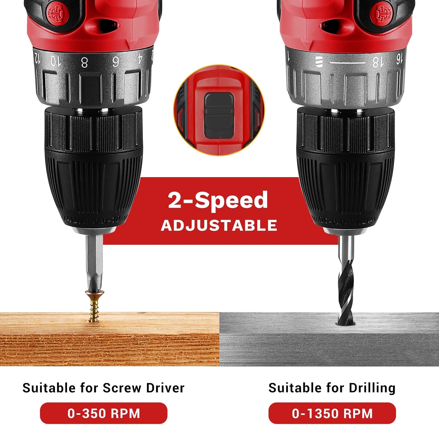 - Optimale Kontrolle: Das 2-Gang-Getriebe ermöglicht dir den Wechsel zwischen kraftvollem Schrauben mit niedrigem Tempo und schnellem Bohren bei bis zu 1350 U/min.