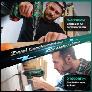 - Zwei Geschwindigkeiten: 0-400 U/min für präzises Schrauben, 0-1600 U/min für schnelles Bohren in verschiedene Materialien