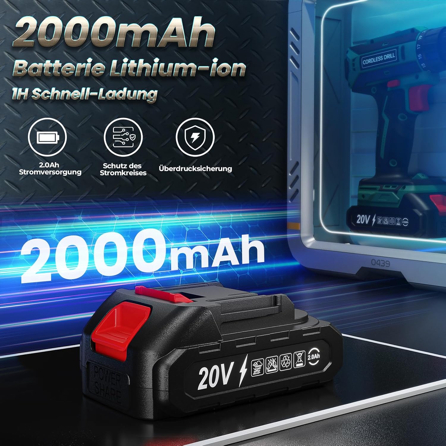 | Lieferumfang | Bohrschrauber, 1x 2000mAh Akku, Ladegerät, Transporttasche, Bedienungsanleitung |