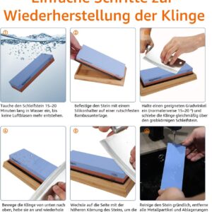 Vor der Verwendung sollte der Wetzstein für etwa 5-10 Minuten vollständig in Wasser eingelegt werden, bis keine Luftblasen mehr aufsteigen. Während des Schärfens sollte die Oberfläche stets feucht gehalten werden. Nach der Nutzung lässt sich der Stein einfach mit Wasser reinigen und sollte an der Luft trocknen.