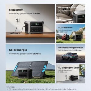 Die C1000 Gen 2 unterstützt die UltraFast-Aufladung: Über die Anker App kann die HyperFlash-Funktion aktiviert werden, die die Powerstation mit 1.600W Leistung in nur 49 Minuten wieder vollständig auflädt. Zudem ist eine autarke Aufladung via Solar mit bis zu 600W in etwa 1,8 Stunden möglich.
