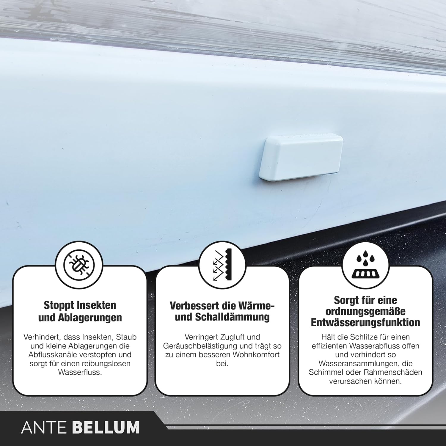 Die Ante Bellum Fenster-Entwässeru Entwässerungskappen richten sich an anspruchsvolle Heimwerker, Fensterbauer und Instandhalter, die ihre Fensterprofile effizient vor Staunässe schützen und die Optik aufwerten wollen. Sie sorgen für eine zuverlässige Ableitung von Kondenswasser bei gleichzeitig optimaler Belüftung der Fensterkammern.