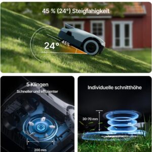 - Leistungsstark am Hang: Mit einer Steigfähigkeit von bis zu 45 % bewältigt der Roboter auch unebene Grundstücke und Hanglagen mühelos.