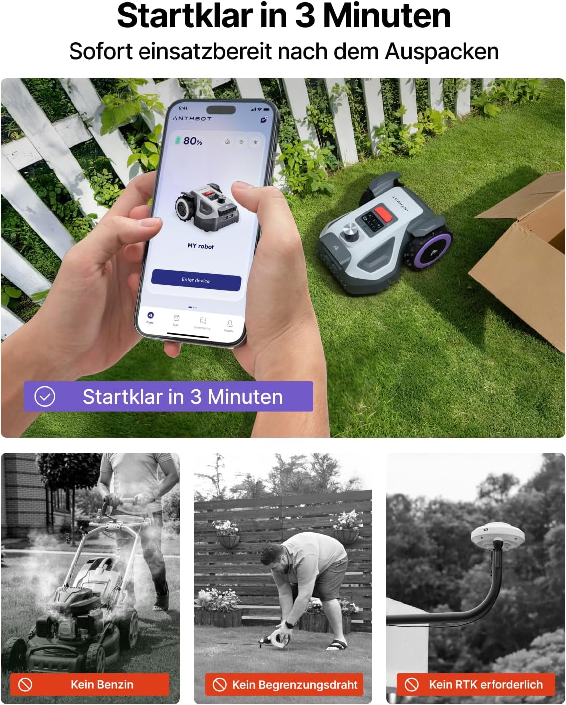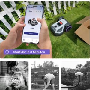 - Minimale Einrichtungszeit: Kein Kabel, keine Basisstation-Montage – einfach hinstellen und den Mähroboter per Knopfdruck kartieren lassen.
