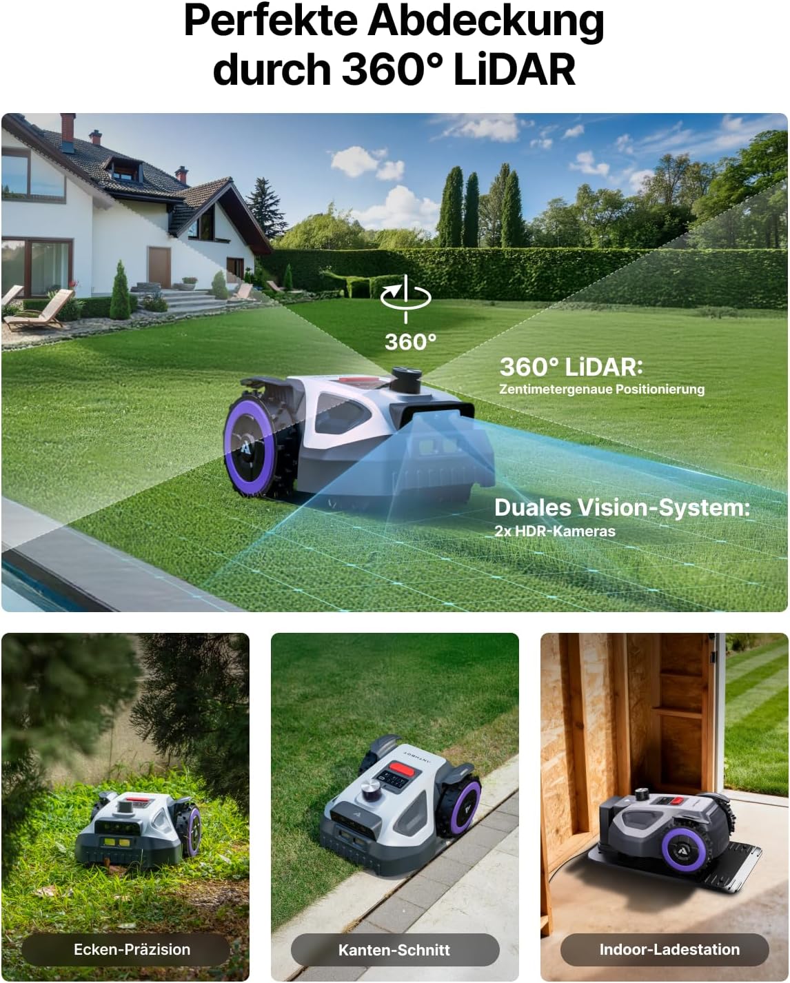 Die meisten modernen Geräte nutzen GPS, aber der Anthbot M5 geht einen anderen Weg: Er setzt auf eine Kombination aus 360°-LiDAR und Dual-Vision. Das ist in der Praxis ein riesiger Vorteil, weil er sich nicht auf Satellitensignale verlassen muss, die gerade unter Bäumen oder an Hauswänden oft abbrechen. Er scannt die Umgebung quasi zentimetergenau ab, sobald du ihn das erste Mal loslaufen lässt.