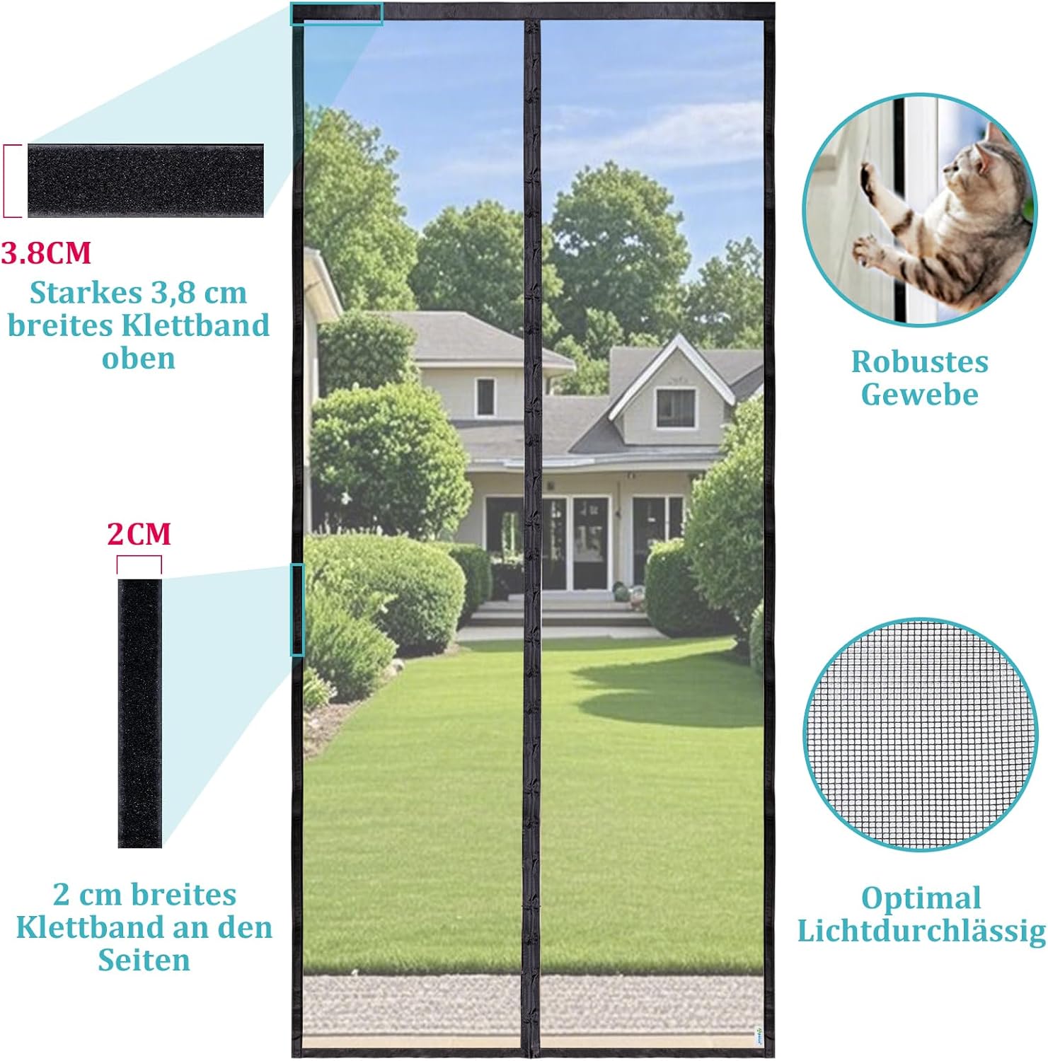 - Lagerung: Über den Winter kann der Vorhang einfach abgezogen werden; das Klettband verbleibt am Rahmen für die nächste Saison.