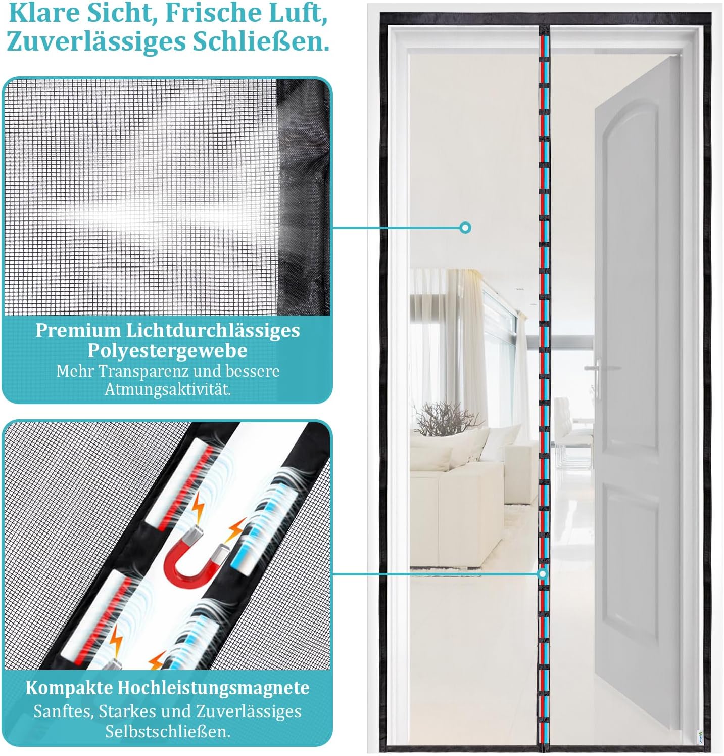 - • Verstärkte Magnetverschlüsse: Sorgt für sofortiges und lautloses Schließen nach dem Durchgang, auch bei zugigen Bedingungen.