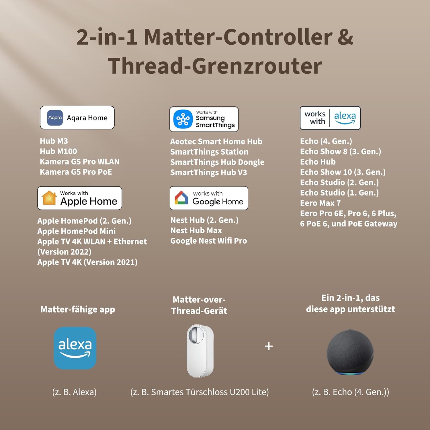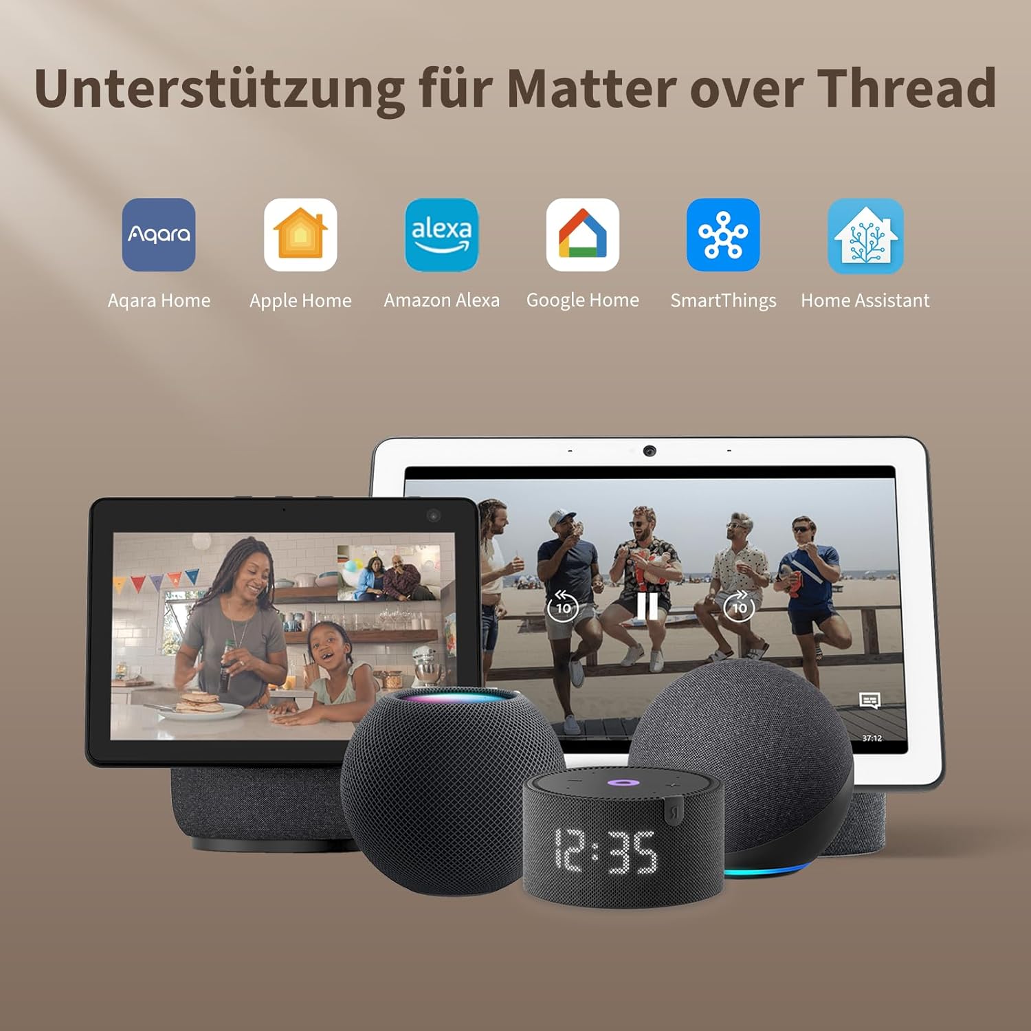 | Kompatible Hubs | Aqara M3, M100, G5 Pro (Thread-Border-Router) |