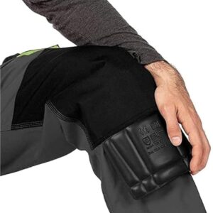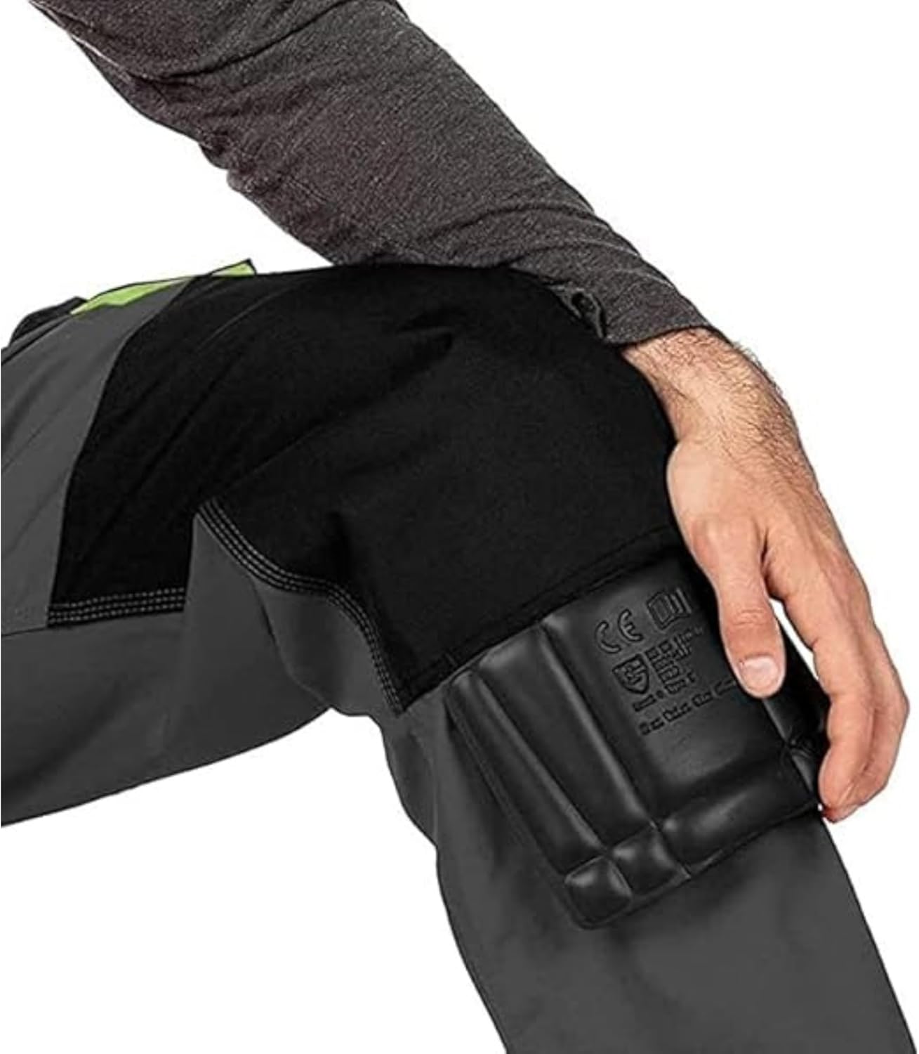 - Sicherheit durch Kniepolstertaschen: Einschubfächer ermöglichen das schnelle Einlegen von Schonern, um Gelenkbelastungen beim Arbeiten auf hartem Boden zu minimieren.