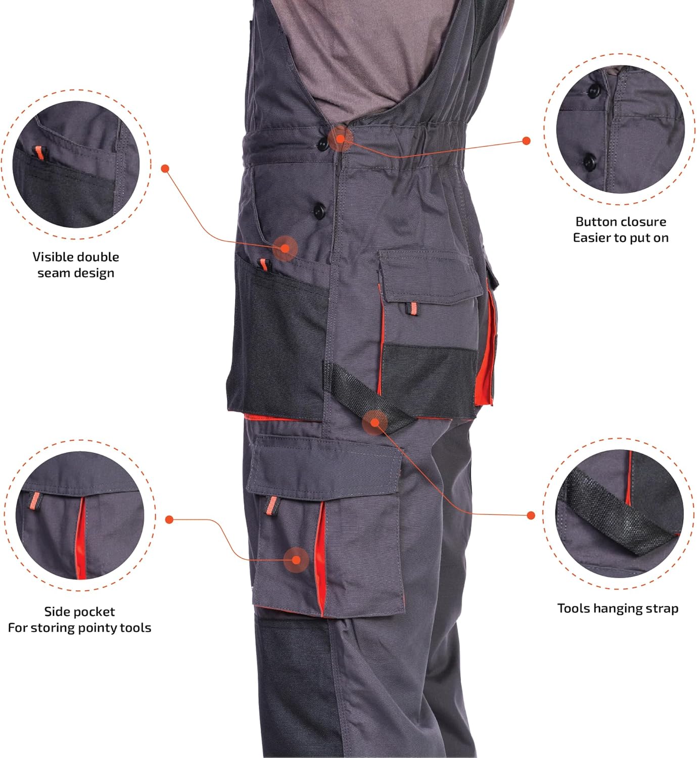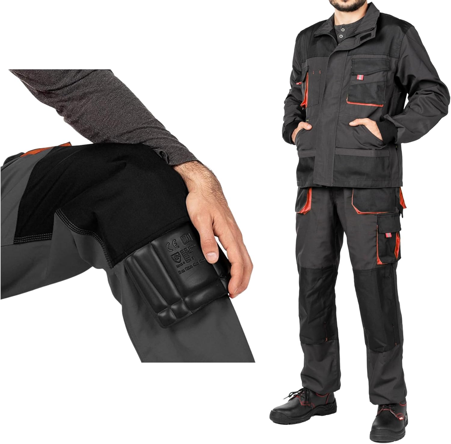 - Integrierte Kniepolstertaschen: Schone deine Gelenke bei Arbeiten auf hartem Untergrund durch einfaches Einsetzen von Standard-Kniepolstern.