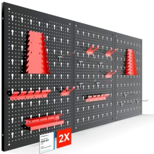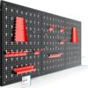 Das Design der Wand überzeugt durch eine gelungene Kombination aus Funktionalität und moderner Optik. Die schlichte schwarze Lochwand in Kontrast mit den roten Haltern sorgt für eine übersichtliche Ordnung und verleiht Ihrem Arbeitsbereich einen professionellen Look.