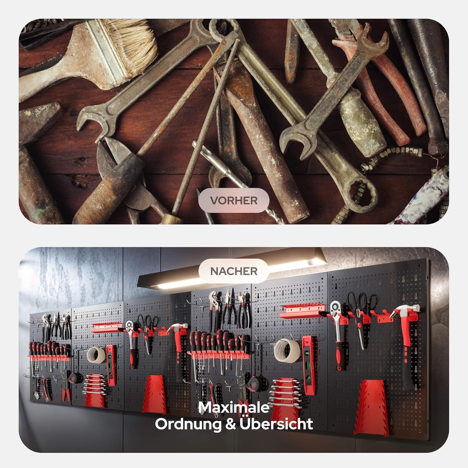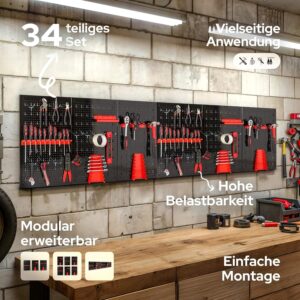 Im Lieferumfang ist neben den sechs Lochplatten ein umfangreiches 34-teiliges Halter-Set enthalten. Dieses beinhaltet verschiedene Haken und Halterungen, mit denen Sie Schraubenschlüssel, Hämmer, Schraubendreher und weiteres Werkzeug ordentlich und griffbereit aufbewahren können.