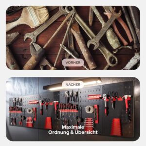 - Modular erweiterbar: Das System erlaubt eine flexible Gruppierung der Platten, sodass du dein Wandlayout bei wachsender Werkzeugsammlung jederzeit anpassen kannst.