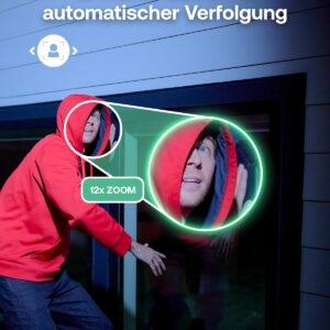 - Auto-Tracking & Zoom: Die Kamera schwenkt und zoomt bei Bewegung automatisch mit; ideal, um Personen über den gesamten Hofbereich zu verfolgen.