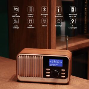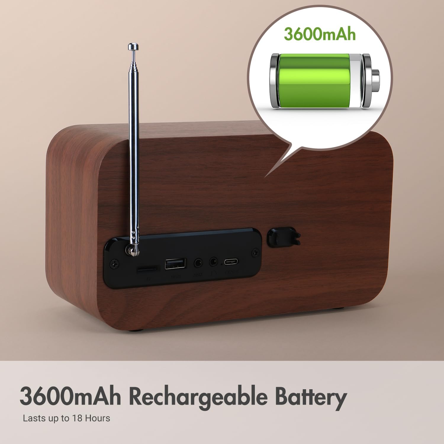 August MB450K Wiederaufladbares DAB+/FM Radio Dual Wecker-Nostalgie tragbares Küchenradio mit 60 Presets Bluetooth 5.3 Lautsprecher Holzgehäuse, USB/AUX/MicroSD, bis zu 18h Betriebszeit, Fernbedienung