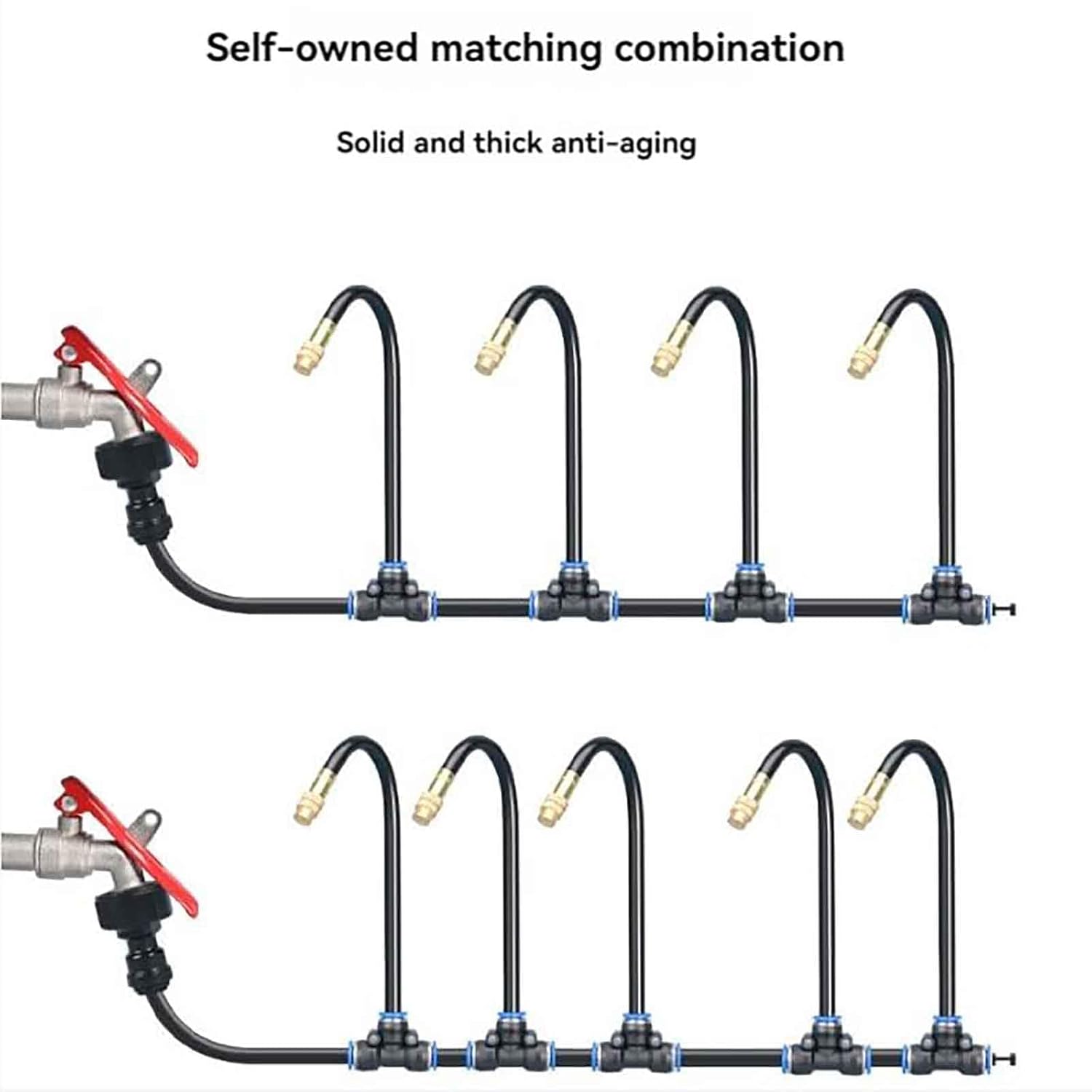 Das System arbeitet mit verstellbaren Sprühdüsen, die an biegsamen Metallschläuchen montiert sind. Diese Flexibilität ermöglicht eine präzise 360°-Omnidirektional-Bewässerung, mit der Sie gezielt Blumenbeete, Gemüsegärten oder schwer erreichbare Mauerecken ohne tote Winkel versorgen können.