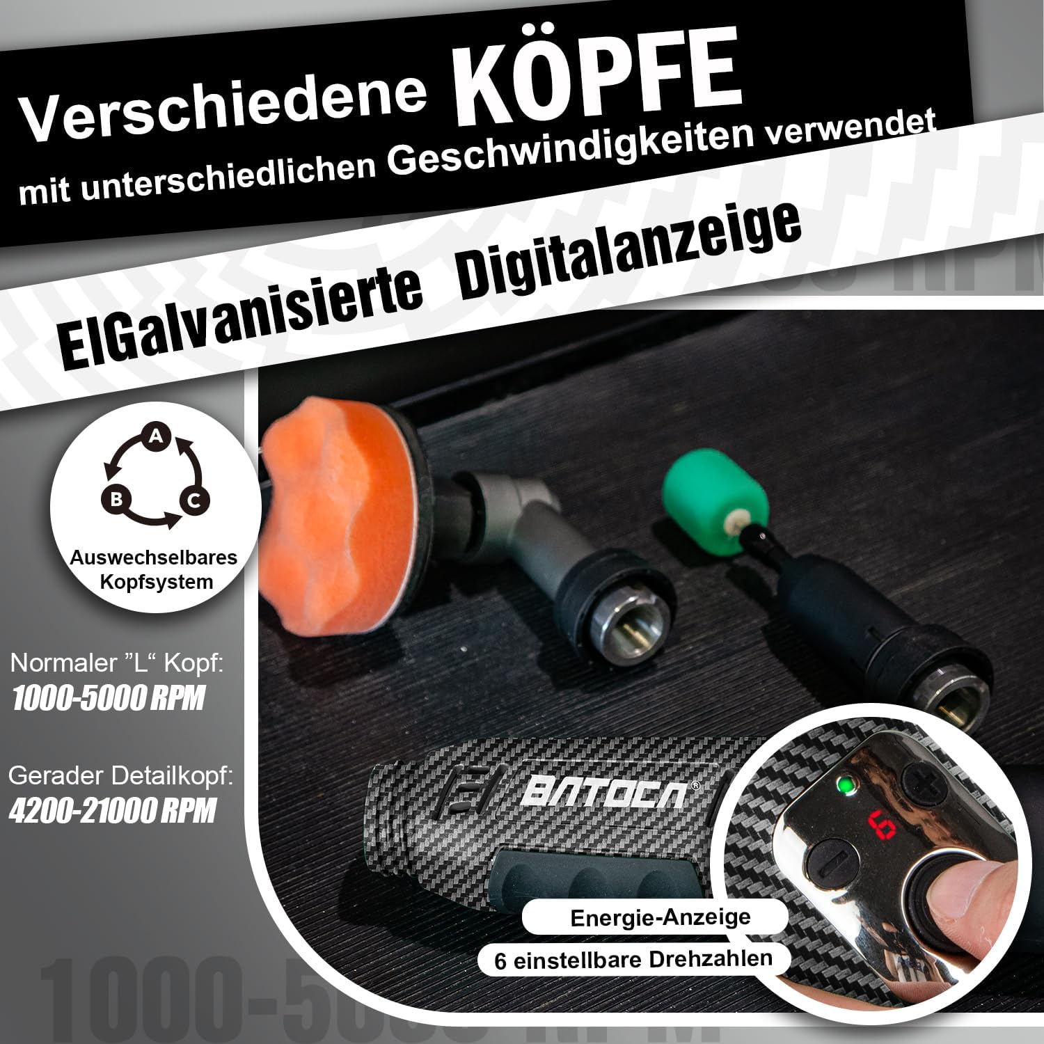 - 【Premium Wahl für die Detailpolitur–Zwei Polierköpfe】BATOCA S6 kabellose Minipolierer ist mit einem Doppelpolierkopf-System ausgestattet. Der L-förmige und der gerade Polieraufsatz erfüllen alle Anforderungen an die Politur in Ecken und Kanten! Er wurde hauptsächlich für Detailarbeit an Fahrzeugen/Booten/Motorrädern sowie für schwer erreichbare Stellen entwickelt, die für größere Poliermaschinen unzugänglich sind.Sowohl bei der Akku als auch bei der Doppelkopf Poliertechnologie setzt BATOCA auf professionellere Technologie. Er zeichnet sich durch stabile Drehzahl, geringe Lautstärke, lange Lebensdauer und hohe Poliereffizienz aus.