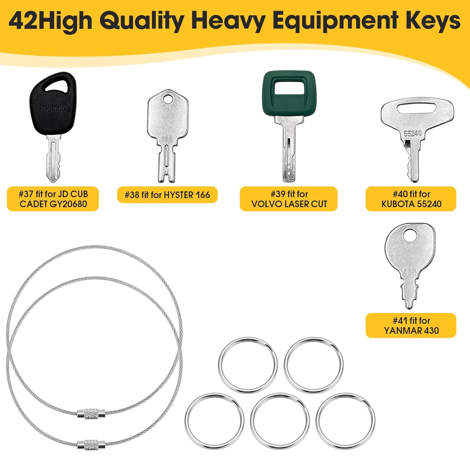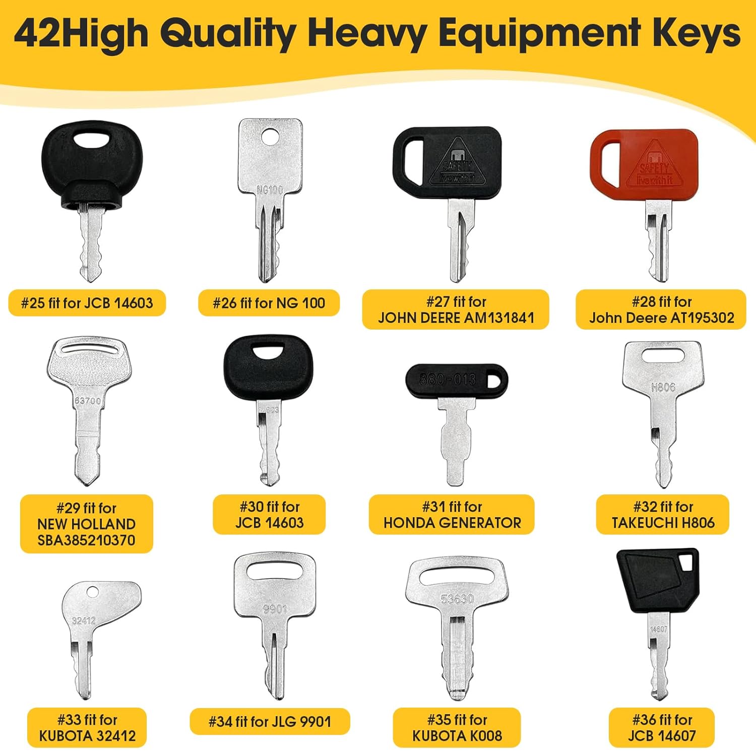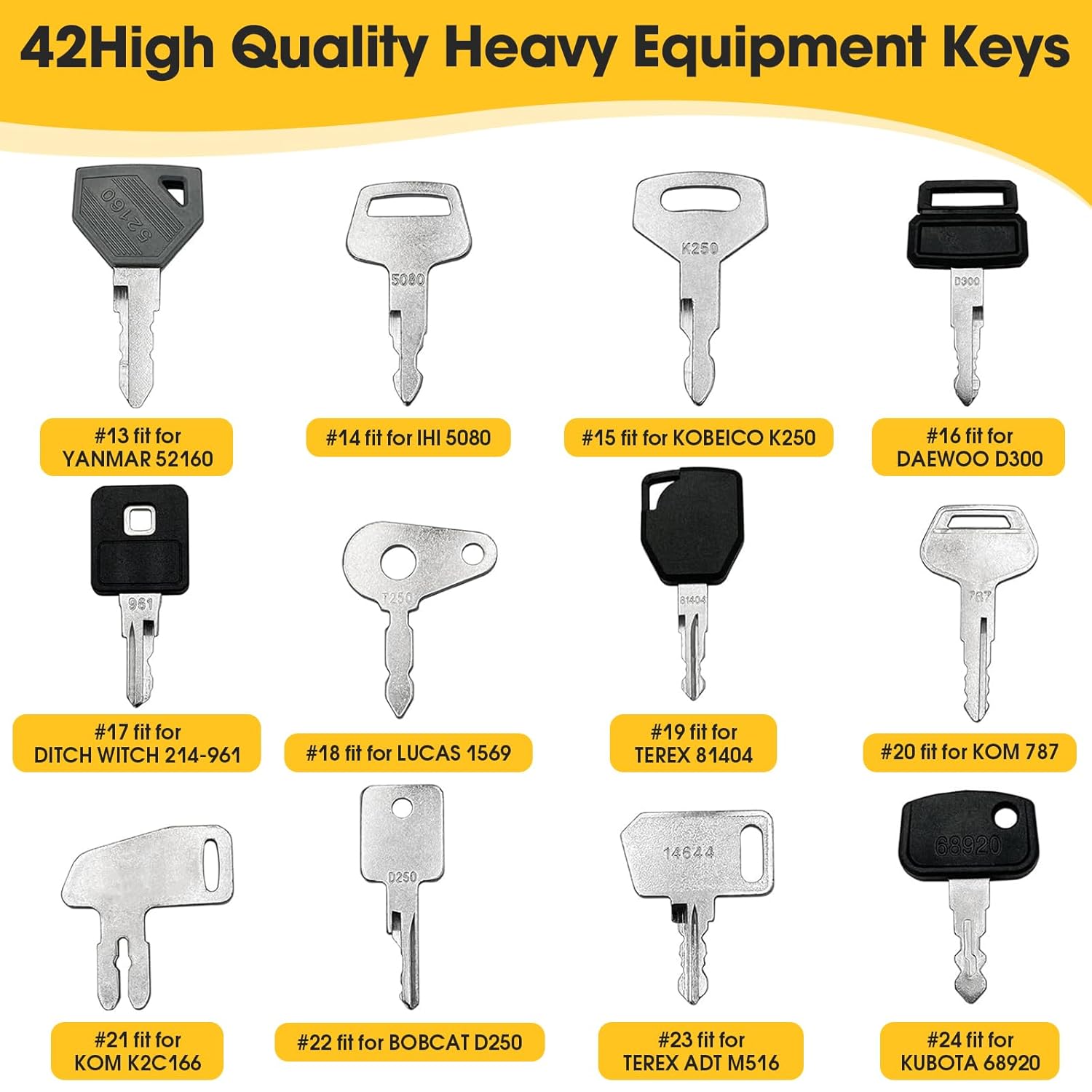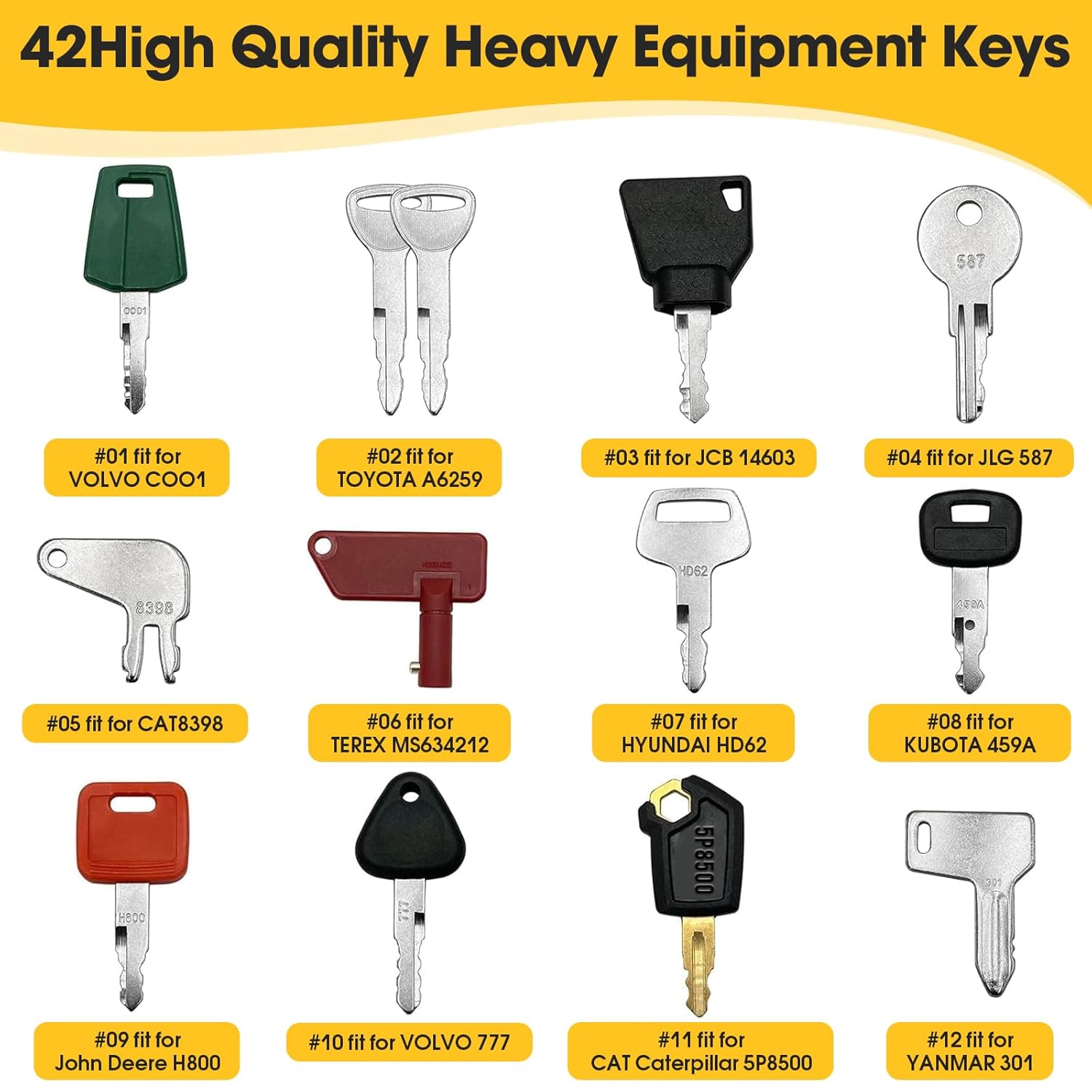 - Maximale Abdeckung: Mit 42 verschiedenen Schlüsseln deckst du nahezu alle gängigen Marken ab, darunter Cat, Komatsu, Kubota, Hitachi und Volvo, was Fehlkäufe vermeidet.