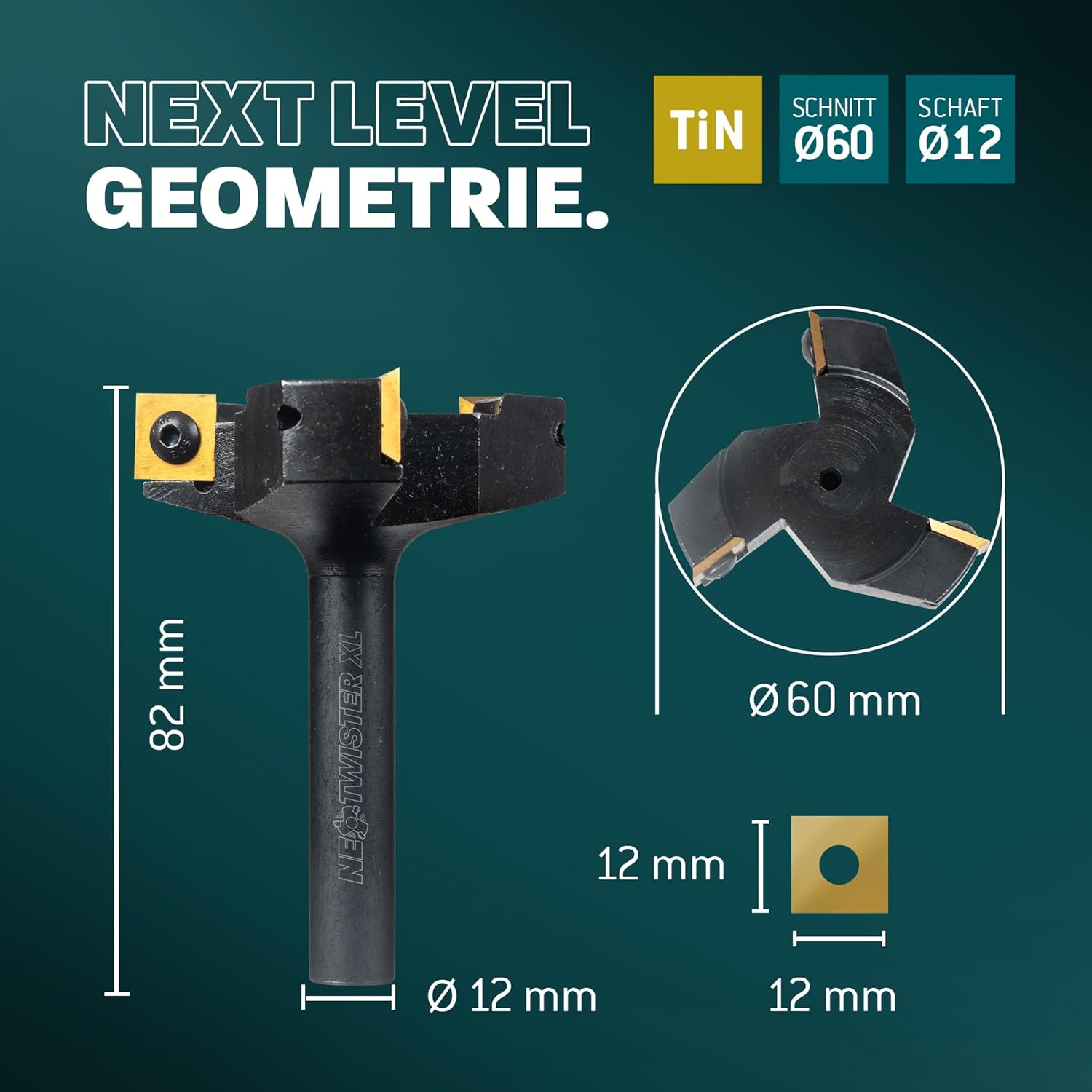 - 12 mm Schaft: Bietet die nötige Stabilität und minimiert die Auslenkung, was essentiell für winkeltreue Ergebnisse bei der Bearbeitung großer Werkstücke ist.