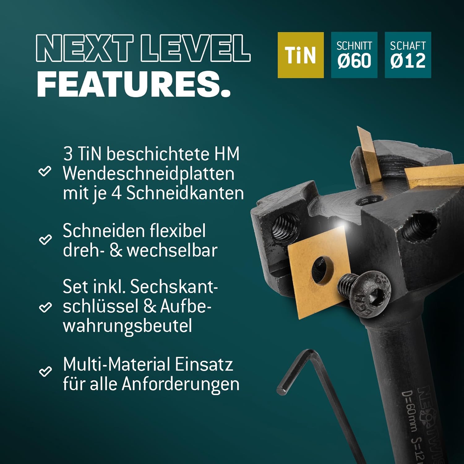 - Tauschbare TiN-beschichtete Wendeplatten: Statt den kompletten Fräser zu schleifen, wechselst du einfach die Messer – das hält die Standzeit exakt auf einem Niveau und spart Zeit in der Werkstatt.