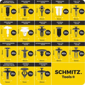 Wenn du regelmäßig an Fahrzeugen arbeitest, kennst du das Problem: Spröde Original-Clips brechen bei der Demontage der Seitenverkleidung ab und das passende Ersatzteil fehlt. Das Befestigungsclips Auto + Auto Demontage Werkzeuge Set von SCHMITZ.Tools schafft hier Abhilfe. Mit einer Auswahl von 660 verschiedenen Kunststoffnieten, Spreiznieten und Schrauben hast du das passende Ersatzteil direkt griffbereit.