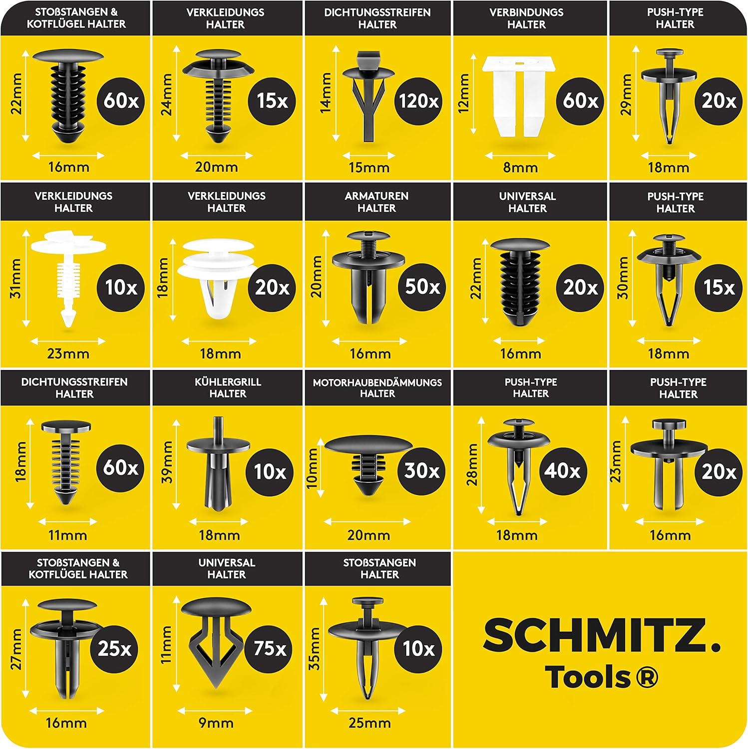 - Riesiges Sortiment: 660 Universal-Clips decken nahezu alle gängigen Fahrzeugmarken und Befestigungspunkte ab.