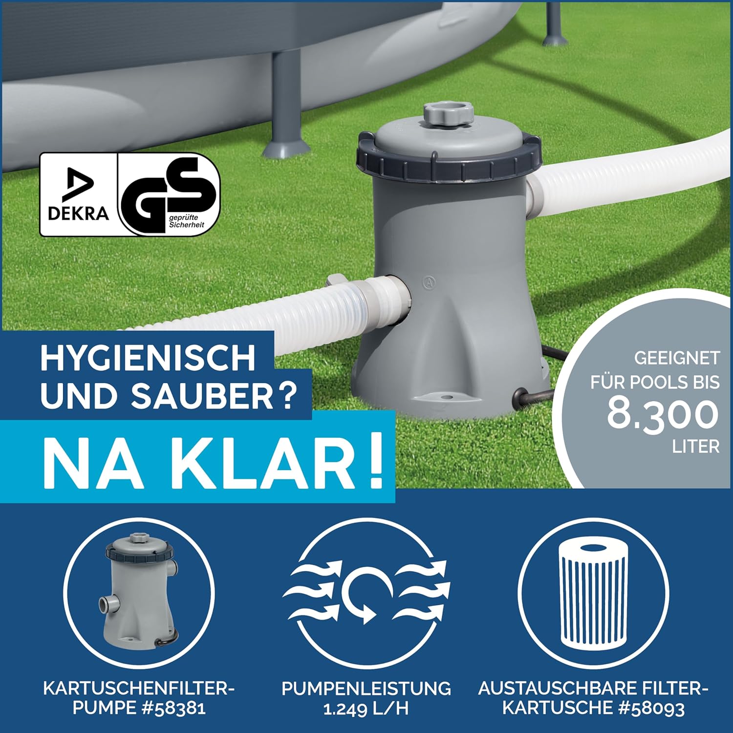Die mitgelieferte 1.249 l/h Flowclear Filterpumpe ist präzise auf das Volumen von 3.668 Litern abgestimmt. Sie ist GS-zertifiziert und bietet ein grundlegendes Niveau an Wasserreinigung. Wichtig zu wissen: Bei hohem Badebetrieb oder starker Sonneneinstrahlung stößt diese Einstiegspumpe an ihre Grenzen. Wir empfehlen als Experten, die Laufzeit der Pumpe täglich auf mindestens 6-8 Stunden zu verteilen, um eine ausreichende Umwälzung des Wassers sicherzustellen.